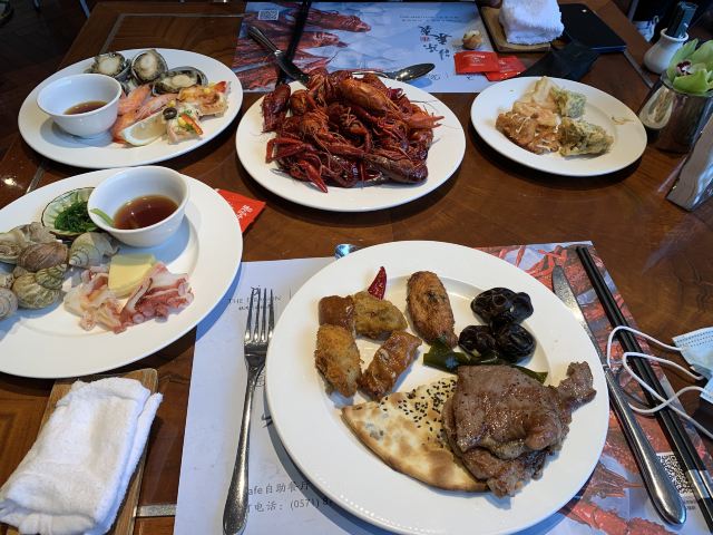 杭州top网红自助餐厅,果然名不虚传,周日晚上一开餐就过去吃,17:40左右人已经要满了,伏特加小龙虾🦞真的棒,口味很独特,味道有点嗲又很清口,觉得被种草了,这次没来得及拍小龙虾一直顾着吃了,哈哈哈~鹅肝的档口一直有人排队,太抢手就吃到两小块,各种海鲜也都超新鲜,尤其推荐生蚝🦪淋几滴柠檬汁上去直接滑入口中,妙不可言。其他还有佛跳墙、正宗西安的biangbiang面一级棒,因为赶时间要去下一场,没有来得及吃更多,下次一定要再慢慢品尝😋