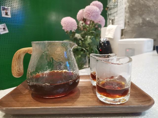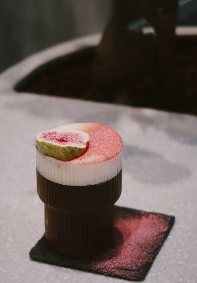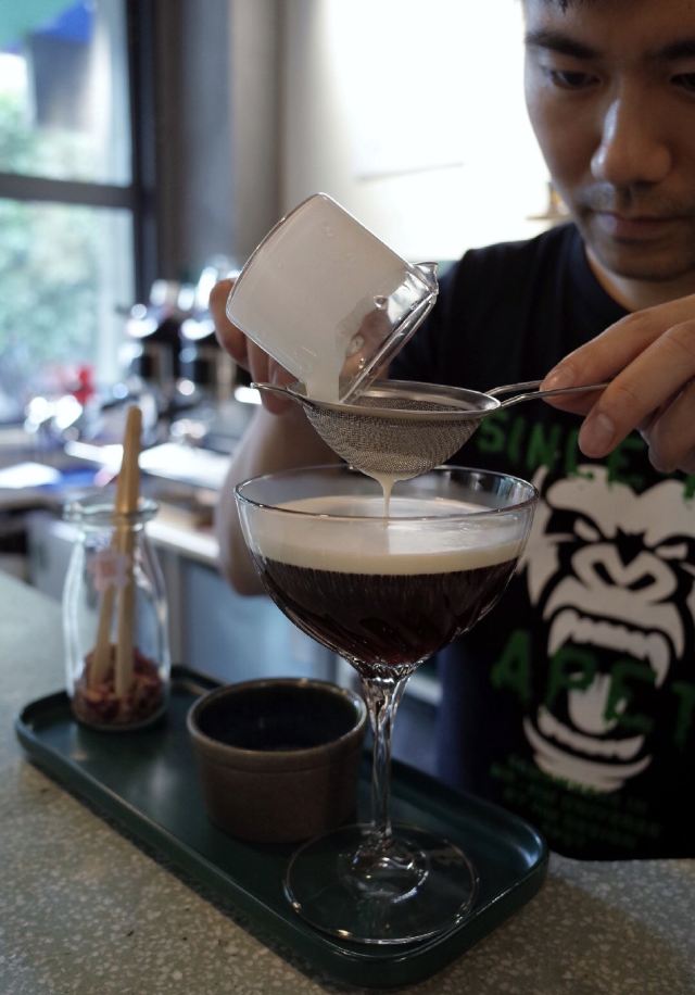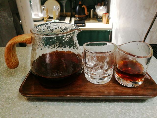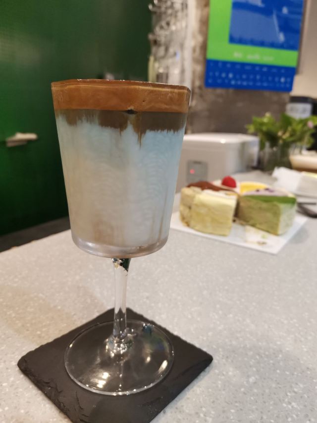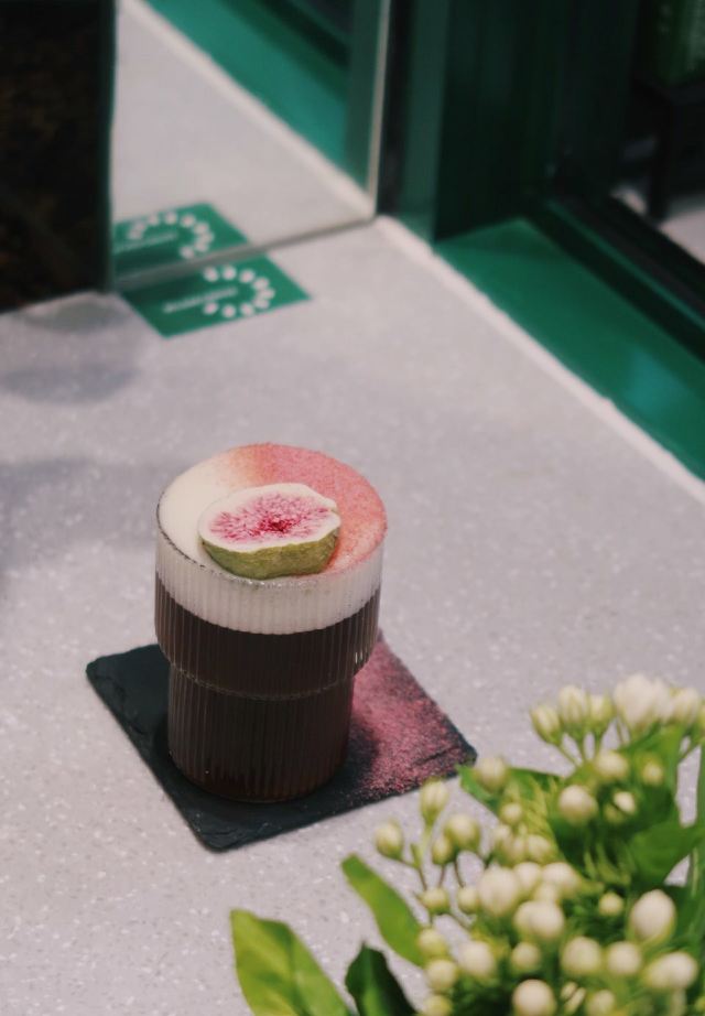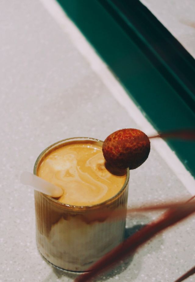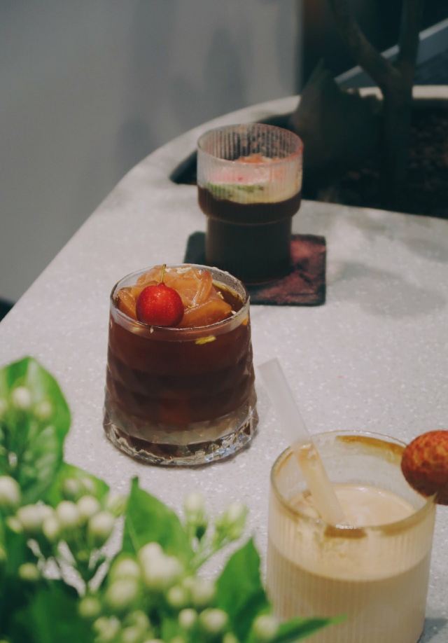 轻轻的一个蚊望着窗外黑压压一片 想起那天盘着腿坐在门口静静看雨喝咖啡的场景。好不舒爽惬意。 雨天倒也不算什么。 ·三杯特调· ▫️水牛奶dirty|我每看一遍这杯的照片都要惊叹一次。这油画般的油脂效果!还有谁!喝起来更是顺滑醇厚 让人误以为是加入了冰淇淋。是有几百年没喝到水牛奶了…尝到第一口就差点哇的哭出来 水牛奶自带的香甜刚好与中烘豆子中和。妙。 ▫Open Summer|一般带夏天名字的都很戳我。除了另外一款新品「憾夏」里面含玻璃 我抿一口就算 实在是无能为爱 但这个我很是喜欢。冰饮似乎少不了酒的元素。这杯里面加入了梅酒 山楂汁做成了玫瑰花冰块。造型颜值高但不太方便入口 只好捣碎成冰沙将其与咖啡融为一体再饮 整体酸味突出。和O.P.S的新品挺像的。对我来说难分伯仲 都饱含了对夏日的依恋。 ▫5号茉莉白桃|一开始最期待这款 但一顿喝下来倒是对这杯的印象不大深刻了。只记得底部沉有白桃果肉 有茉莉花清香 但白桃本身的味道被各种掩盖了…