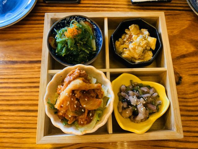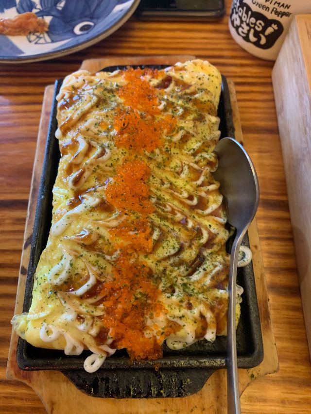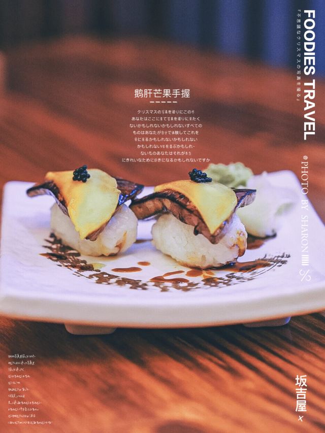 芒果鹅肝手握,牛肉寿喜锅,海鲜玉子烧,三文鱼刺身,芝士焗蟹宝,三文鱼大脂厚切,土豆泥,蟹籽土豆沙拉,虾仁蛋包饭,烧鸟拼盘