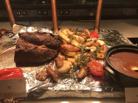 在北海银滩皇冠假日酒店开会,由于酒店才开业1个月,有些设施还不完善,我们在全酒店唯一开业的餐厅吃了早中晚3顿饭。 晚餐是自助,海鲜品种比想象的少,主要是在上海吃了亚马逊美食百汇,各大酒店自助餐再也看不上眼了。但是相对来说,这个188元的自助餐便宜很多啊~~所以也可以吃吃,就是晚上不能吃甜品不能吃哈根达斯[流泪]为了不长肉,要忍住! 午餐吃的商务套餐,比想象的好多了,味道不错,干净、方便,同事们大多把菜都吃完了,还有汤和水果。中午餐厅也不营业,非常安静,餐厅外面就是泳池,景色不错,心情愉快。 早餐就是一般酒店的自助早餐,无功无过,各种粥、各种粉、各种包子,绝对能吃饱。 总的来说,还是很不错的。