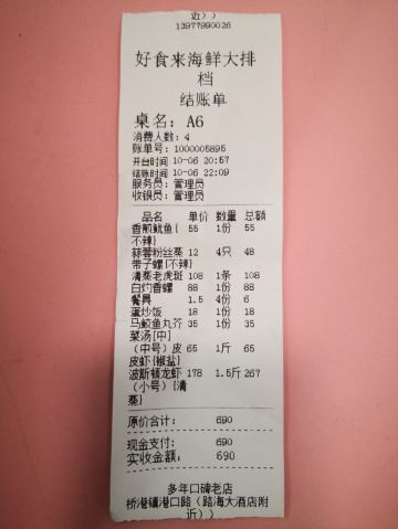 味道不错,是本地清淡系的海鲜风味,美中不足的是每海鲜的做法是扫码点单时固定好的,无法选择是清蒸,还是姜葱炒,或者红烧、避风塘、芝士焗等口味。 餐馆内部环境还可以,虽是路边排档,但参观内没有苍蝇,这点比较得分。 点单是扫码下单,大部分海鲜是按条、个、份算的,极少部分是称斤。上菜速度非常快,从下单结束到上完所有菜,不到15分钟。
