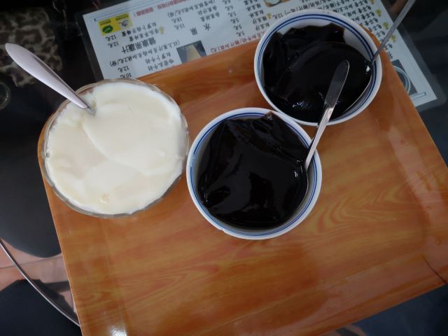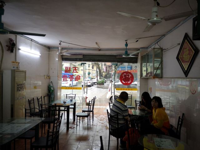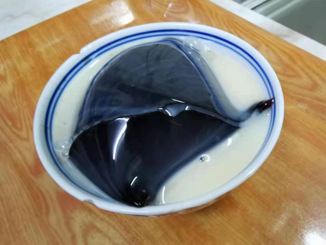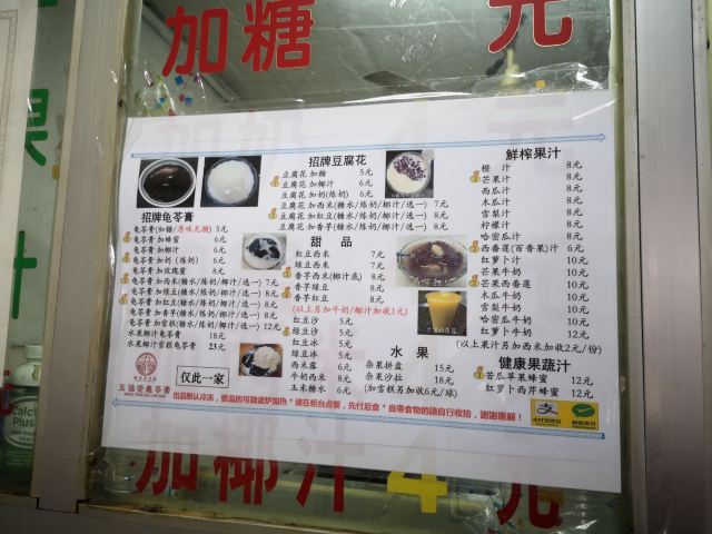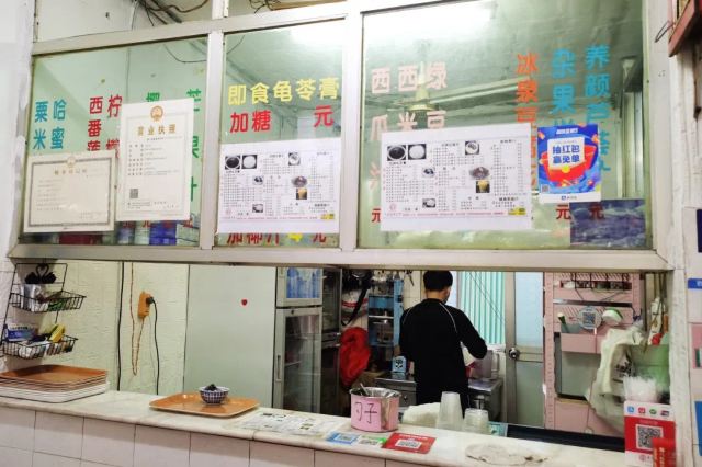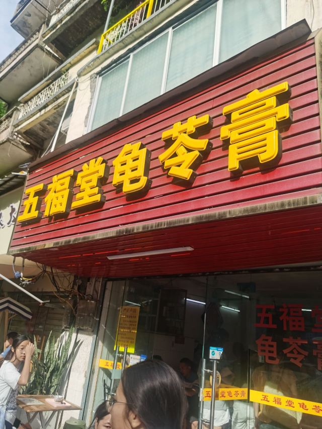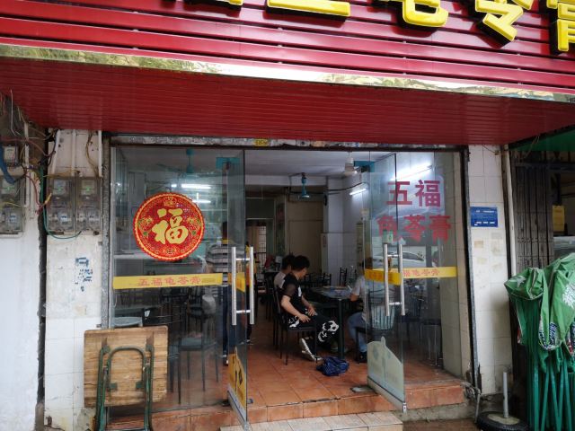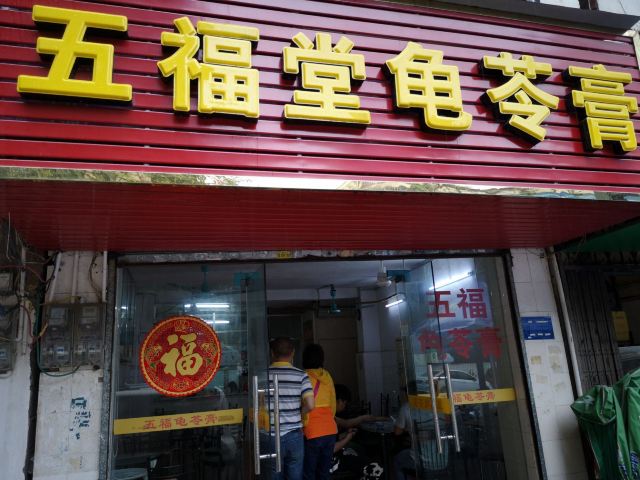 梧州龟苓膏小店遍地都是,五福堂算是比较知名的老店。老板何生以前任职当地龟苓膏厂,1993年下海开了自家小店五福堂,这一开就二十多年。店铺不大,几张八仙桌和后厨倒也干净整洁。餐牌上写着“仅此一家”。 除了传统炼乳、蜂蜜汁、椰汁龟苓膏,五福堂还有加西米、绿豆、红豆、香芋、雪糕和水果等,价格从5元到12元不等,最贵是水果椰汁雪糕混搭要23元。除此之外,小店的招牌还有「椰汁豆腐花」,各种广式传统甜品以及鲜榨果汁,林林总总也有近50个选择,不过都是龟龄膏及其搭配的衍生品。
