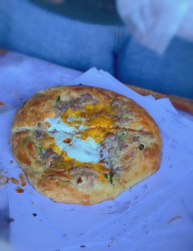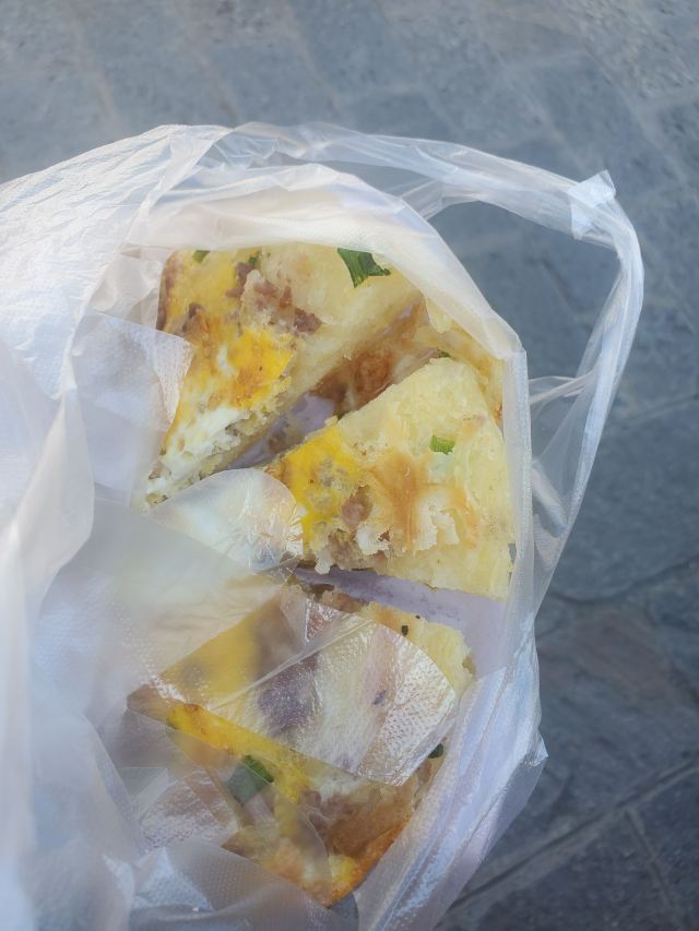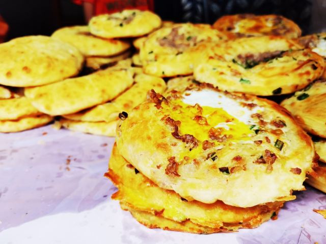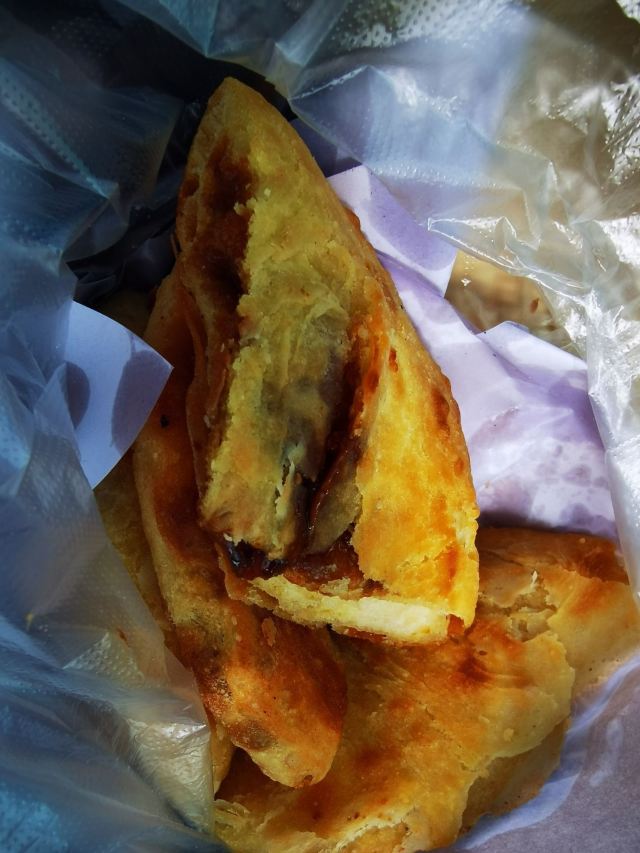 《4000公里一个月环游云南》 整体来说对云南的食物没有太大喜好,一般属于尝一下特色就好了的心理。但喜洲粑粑是真心喜欢,属于那种平常也愿意买来当早餐的主食。 这家一共四种口味,两甜两咸。 咸的选了|豪华版喜洲粑粑^,本来是给家里那个肉食爱好者的,不过大家尝了一下都很喜欢,鸡蛋和面融合的感觉很棒。 甜的|传统红糖粑粑^和|玫瑰豆沙^风格不太一样,后者更像是普通馅饼,没什么特色了,还是喜欢传统的,嚼起来口感很香。