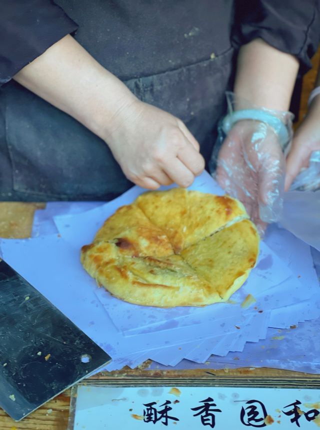 横竖是二温小迪惊呆了,买个粑粑竟然排队排了50分钟。粑粑的味道其实还可以,但是排队那么久,真心不值得! 这家酥香园也算喜洲最红的粑粑了,一共4种粑粑,甜味的,咸味的各两款。 甜味的有10元的玫瑰豆沙红糖馅和15元的限量版的,没想到我们下午5点买也能买到一天销量40个的限量版。 咸味的有10元的葱花肉,还有20元的豪华版4层肉加鸡蛋的。 我们买了一个豪华版和一个限量版的。豪华版的,真没吃出四层肉的感觉,就是肉饼炖蛋口味的咸大饼。限量版的吃起来有股焦甜的香气,不过饼吃两口,就觉得很干。 还有体验不好的地方就是,排队的地方好多车经过,一直打断排队的队伍!搞不懂,古城这个区域不是不能通车的么!