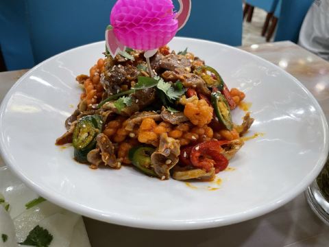 手抓羊肉,八宝菠菜,炒鸡,炒牛肚,羊肉面片,发菜汤,清炒荷兰豆,烧杂菌,东乡土豆片,三炮台茶,烤羊排,手抓饼