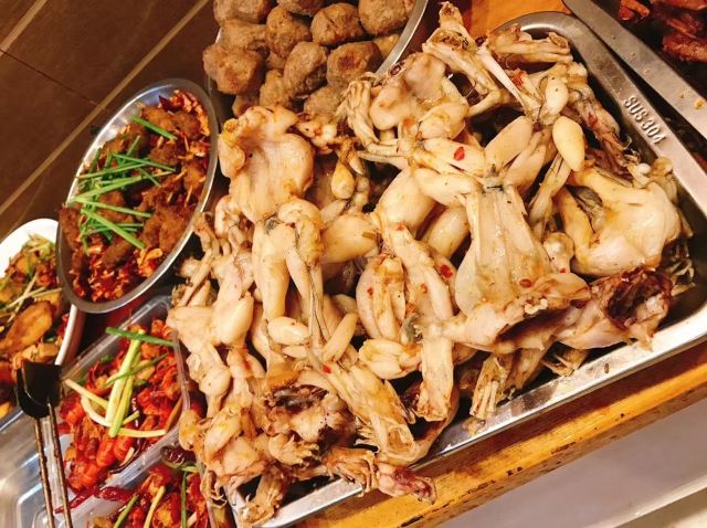 卤水田鸡,炸藕圆,鸡翅,全味虾球,招牌姜辣鸡爪,牛肉锅贴,藕圆子,卤水牛蛙,牙签肉,红油凉面,凉拌毛豆,牛肉煎饺,炸鱼,原汤虾仁云吞,鸡柳