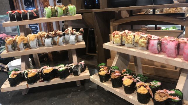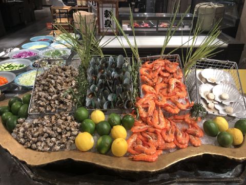 波士顿龙虾,三文鱼,冰淇淋,海鲜刺身,黑蒜烤生蚝,甜点,澳洲羊排,寿司,烤大虾,冰镇基围虾