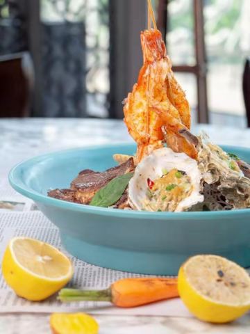 海鲜做的很不错,尤其是泰式咖喱龙虾,味道太鲜美了。冷的蟹腿肉口感很好,清甜,很喜欢。青口贝黄多,牛羊排还是挺不错的,水果披萨挺好吃。