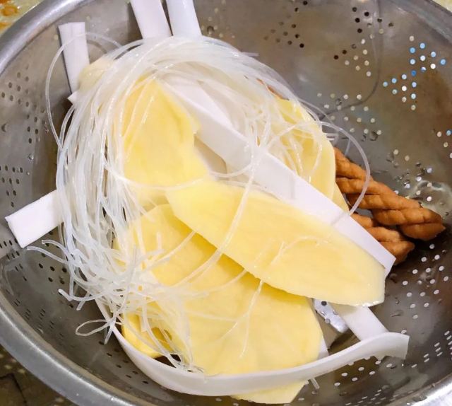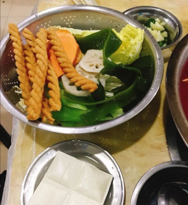 红薯,片片鱼,热干面,冷锅鱼,麻花,调料碗,配菜,冷锅鸡,藕片,千张,莴苣,甜瓜,金针菇