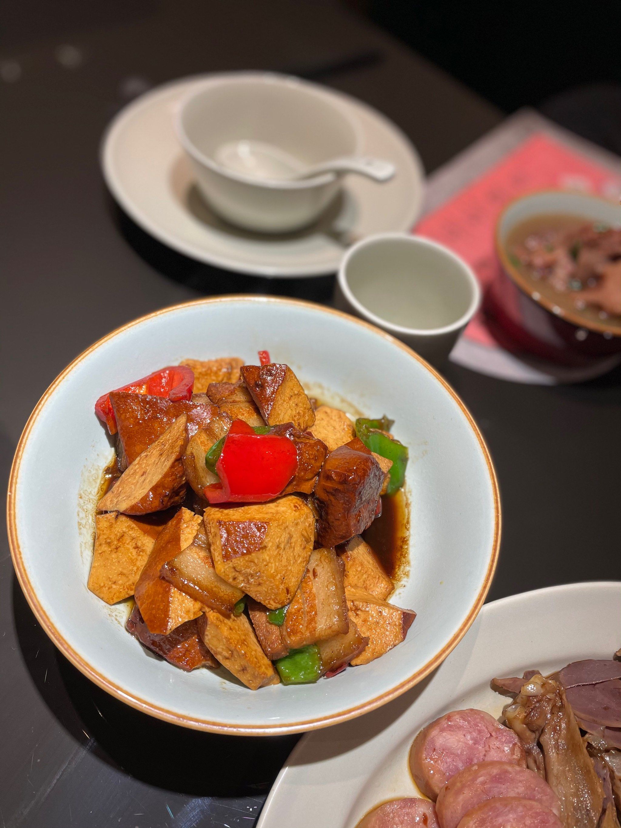 干煸小刁鱼,鸡汁珍珠丸子,简单豆腐,时蔬,香干回锅肉,传统酱油粉蒸肉,糖醋带鱼,枣香红烧肉,卤水拼盘,莲藕排骨汤