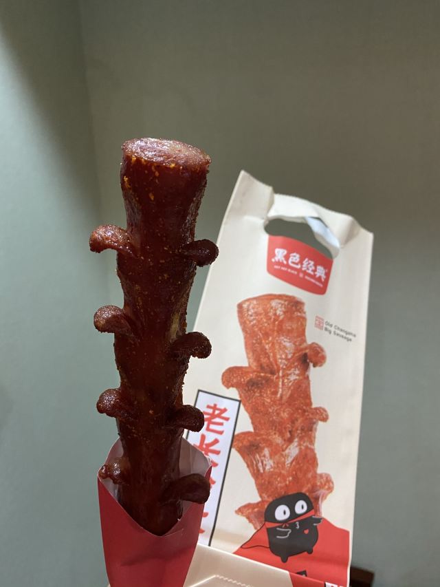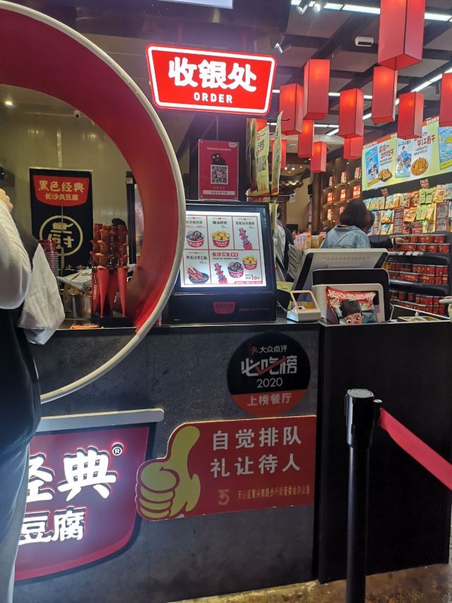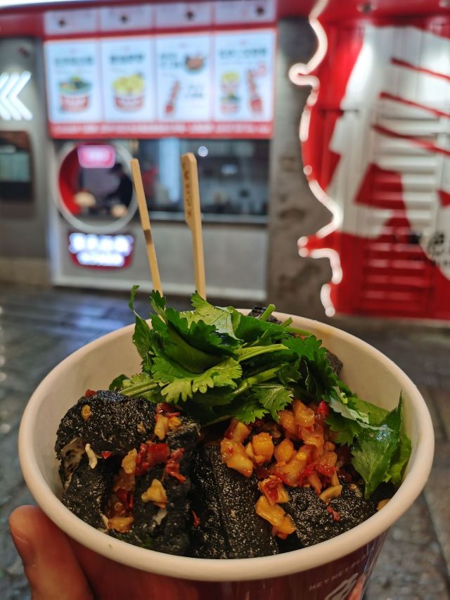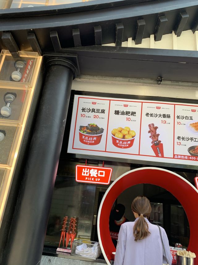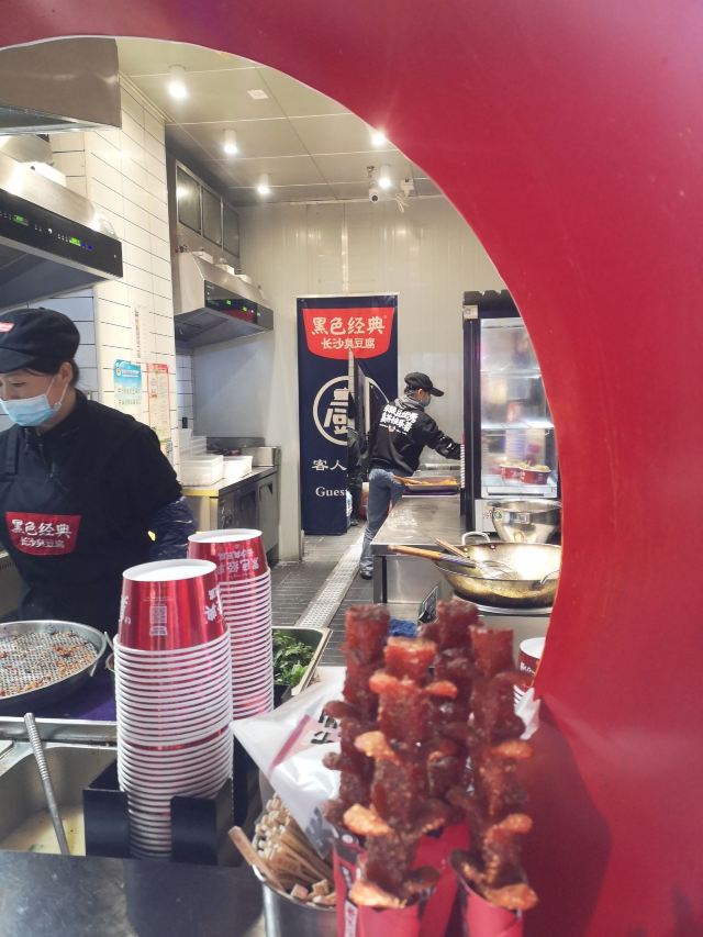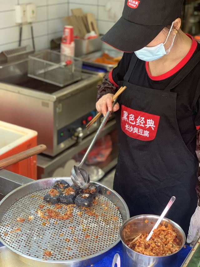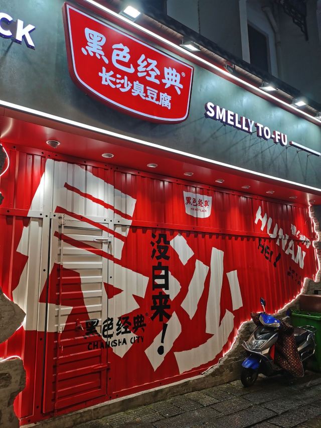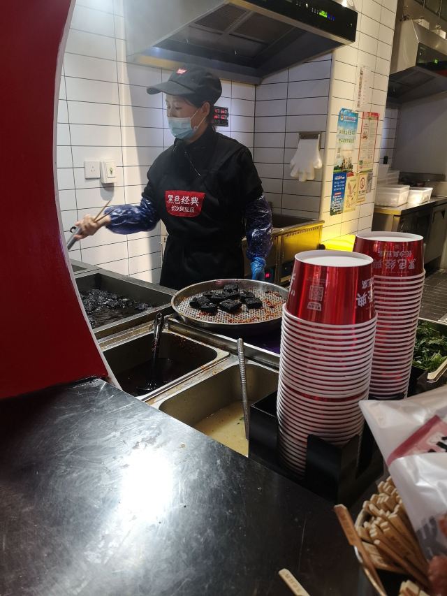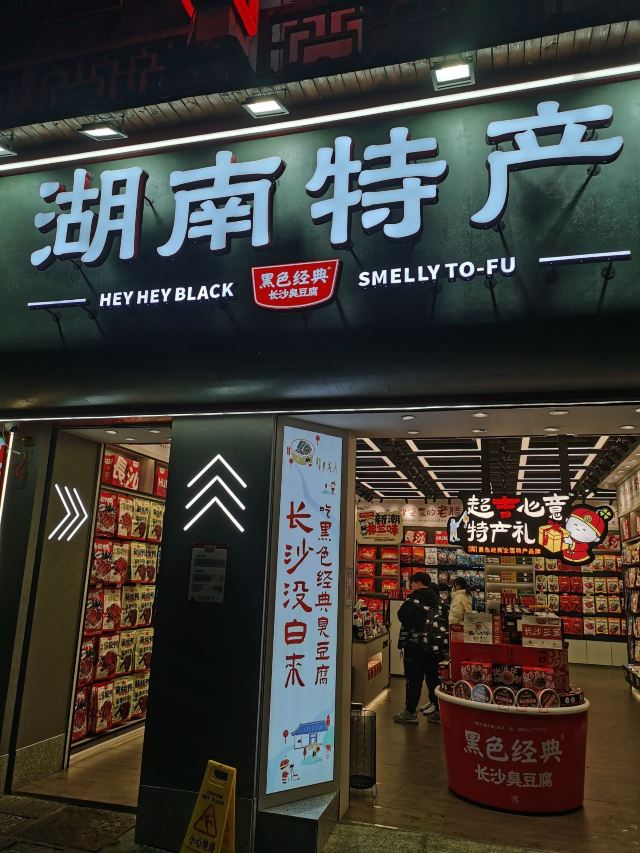 摩小亚说起湖南长沙小吃,大家可能第一时间会想到的就是臭豆腐。 而这臭豆腐里面,算是很有名气的应该是这家黑色经典吧。 反正我对这个不排斥,但是所喜欢肯定算不上,可以吃吃而已吧。 来都来了,肯定要尝尝这最有名的臭豆腐品牌呀。 我是早晨去的,所以没什么人,完全不用排队,点单到开吃也就炸的时候等那一下下而已。 点了一个想小份的臭豆腐,6片10元。 比我预期的要好吃一点,因为每一块黑黢黢的豆腐中间都有醸入一些大头菜一类的小料,然后递给客人前还会淋一勺辣酱,所以味道还是蛮重的。 臭真的是闻起来臭,吃起来不会臭哈。 这小吃店的旁边就是一家他们品牌卖伴手礼的商店,其实顺便买点回去送同事朋友也是很不错的。