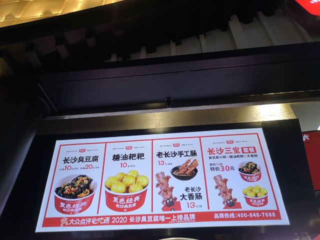 黑色经典臭豆腐,长沙臭豆腐,老长沙糖油粑粑,老长沙手工肠,经典湘辣爪,薄荷凉茶,香辣无骨鸡柳,脆皮黄金蕉,大碗臭豆腐,老长沙大香肠,黑色经典长沙臭豆腐,大香肠,糖油粑粑,黑色经典老长沙大香肠,黑色经典臭豆腐生胚