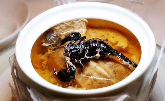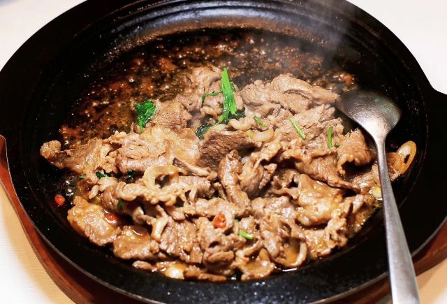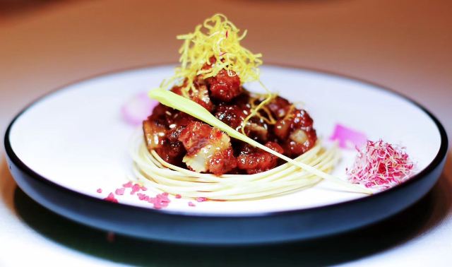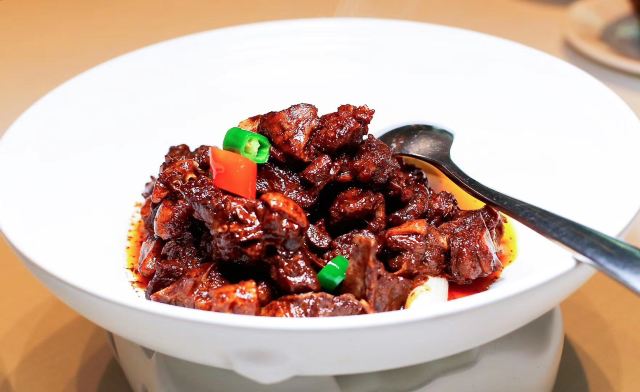 室外有个院子但是太阳大也不能坐,菜品我是冲着血鸭而去,毕竟我对这道永州菜是很有感情,本应该很辣的特色菜在这里除了木姜子油的味道外根本没了辣这个元素,肉太大块,没有把血揉入骨头的缝隙,大相径庭;蝎子汤和擂辣椒皮蛋做的不错;堂烹雪花牛肉居然就是石板上煎牛肉,因为这种方式很难掌握火候。