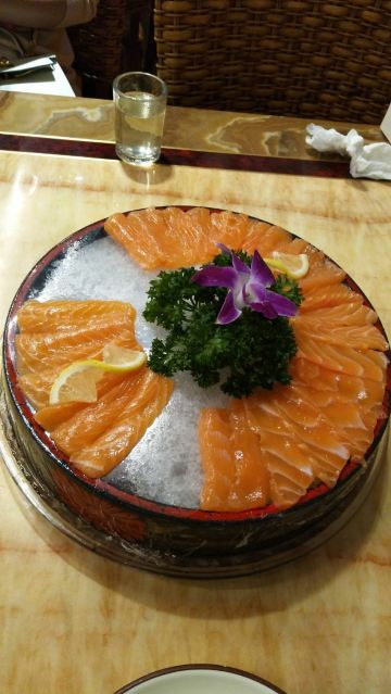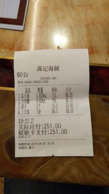 熊大最帅周末时懒得做饭,想着很久没去海鲜市场觅食了,就带着老婆去了这里。再次来高记才发现好像重新装修过,似乎大厅比以前更宽敞更明亮!此时客人还不多,选定了位子我便马上去挑海鲜,生怕过会人多了,上菜得够咱们等的。看着三文鱼品相还不错,又全是切成68元一包的独立装,份量较适合两人的,于是点了一块;瓜子斑以前没吃过,看在水中的样子挺有活力,挑了一条;大螃蟹张牙舞爪似乎很诱人,也选了一只;为了凑个双数,接着又点了几个带子。四样东西(不含税票)买单价250多元,还算比较合理!回座位只等了不到二十分钟菜就上齐了,此刻大厅里几乎已坐满了人,服务人员就显得有些手忙脚乱了,这证明咱时间掐得准,这会我还挺得意!三文鱼刺身、咸蛋黄焗蟹、青蒸带子味道还算中规中矩,但青蒸瓜子斑却很差劲!挑鱼时看着活蹦乱跳的,端上桌却是松松散散,肉质既无新鲜劲也没入味,我俩有些怀疑食材是不是被厨房调包了?同时鱼的汤汁还偏多,冲淡了味道。一看就是让蒸汽回流到菜盘里了,不但浪费了食材还要收20块加工费,真是感觉不爽!最后七七八八的费用又收了近百块,顿时又感到有点不值了!