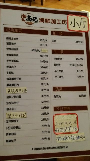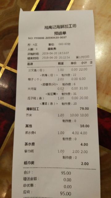周末时懒得做饭,想着很久没去海鲜市场觅食了,就带着老婆去了这里。再次来高记才发现好像重新装修过,似乎大厅比以前更宽敞更明亮!此时客人还不多,选定了位子我便马上去挑海鲜,生怕过会人多了,上菜得够咱们等的。看着三文鱼品相还不错,又全是切成68元一包的独立装,份量较适合两人的,于是点了一块;瓜子斑以前没吃过,看在水中的样子挺有活力,挑了一条;大螃蟹张牙舞爪似乎很诱人,也选了一只;为了凑个双数,接着又点了几个带子。四样东西(不含税票)买单价250多元,还算比较合理!回座位只等了不到二十分钟菜就上齐了,此刻大厅里几乎已坐满了人,服务人员就显得有些手忙脚乱了,这证明咱时间掐得准,这会我还挺得意!三文鱼刺身、咸蛋黄焗蟹、青蒸带子味道还算中规中矩,但青蒸瓜子斑却很差劲!挑鱼时看着活蹦乱跳的,端上桌却是松松散散,肉质既无新鲜劲也没入味,我俩有些怀疑食材是不是被厨房调包了?同时鱼的汤汁还偏多,冲淡了味道。一看就是让蒸汽回流到菜盘里了,不但浪费了食材还要收20块加工费,真是感觉不爽!最后七七八八的费用又收了近百块,顿时又感到有点不值了!