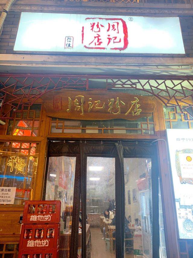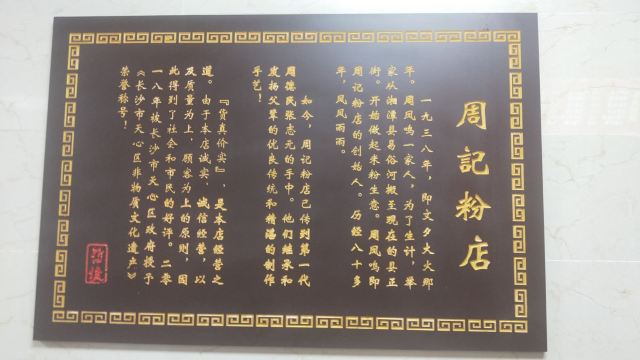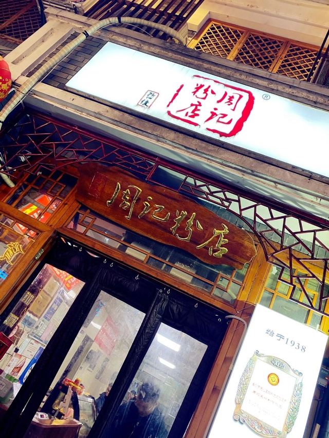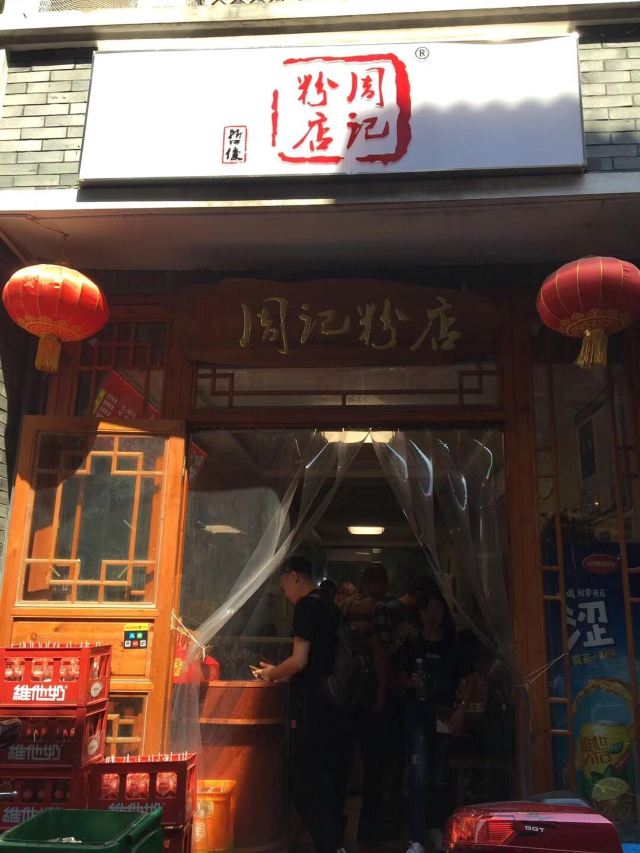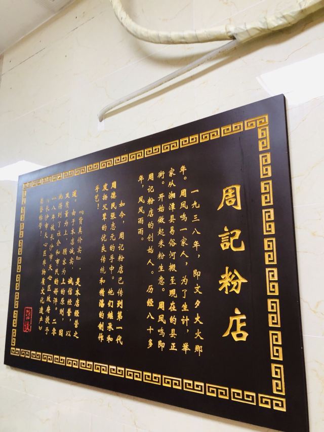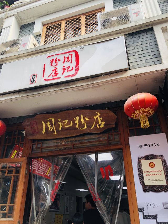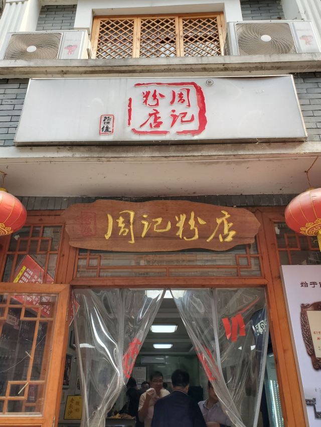 店名:周记粉店 地址:长沙芙蓉区蔡锷南路县正街16号 营业时间:全天24小时营业 体验菜品: 原汤肉丝粉,单价11元一碗,到店出示支付宝二维码给店家扫码付款。会给两个牌子,走到里面做粉处给牌号子说是一个牌号粉一个牌码字),这家面是扁粉,面条比较劲道,汤汁鲜美,里面放有不少牛肉,还有一些葱,味道还挺好吃的。推荐。 环境: 店里有十张桌子,其中一边六张桌子,另一面三张桌子靠墙。桌子上有筷子、辣椒、酱油、醋等调料,墙上有两处挂有抽纸,店里有3个空调。里面是工作重地闲人免进。店里环境比较简单,有插口可以手机充电,待着也还可以。 这是一家网红店,因汪涵常光顾而名声大燥的粉店,也是本人慕名来打卡的一家长沙热门粉面馆。