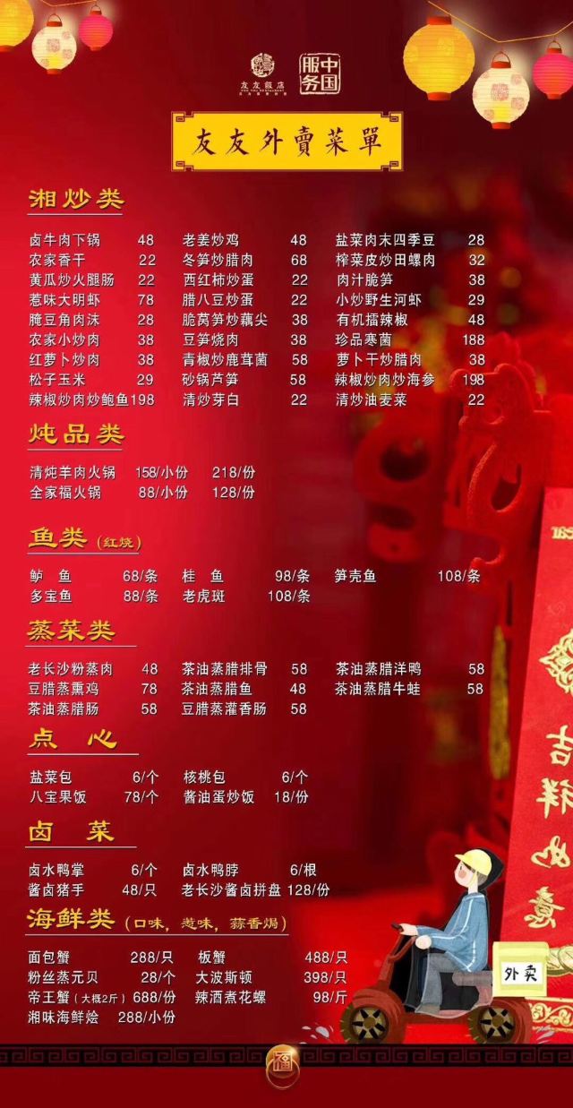 灯笼椒牛蛙,口味鳝鱼,油焖大明虾,友友招牌烤鸭一吃,匠心小炒黄牛肉,一品金香豆腐,老长沙酱卤拼盘,石锅肉沫烧海参,油焖黑虎虾,铁板雪花牛肉,姜浸桂鱼,豉油蒸边鱼,生炒牛肉,子姜烧排骨,龙骨汁海带丝,香芋蒸排骨,牛肉丝,铁板黄鱼,鸡汁笋丝,腊八豆炒土鸡蛋