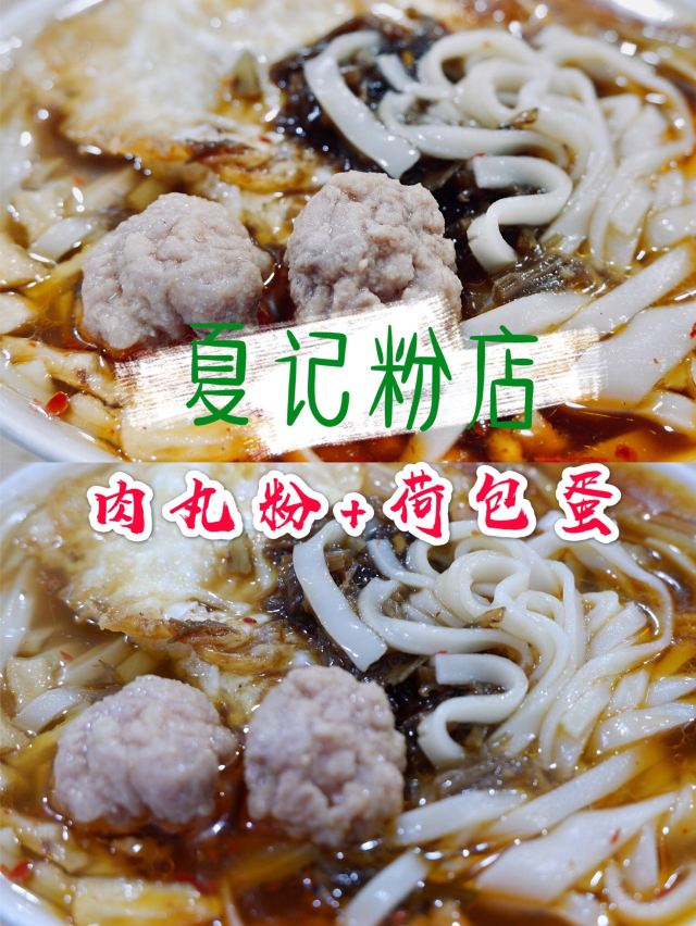 筱风姿又是一家粉店,没想到进入必吃榜的有那么多家粉店,睡到晚上7点多起来出去吃饭,那就吃个粉吧,顺便逛个必吃榜吧,反正都要吃。 店铺:夏记粉店 位置:观音井巷4号(近步行街中心广场) 交通:我从黄兴路步行街步行过去的,也不远、找到观音巷就到了 环境:一般吧,主要是阿姨擦桌子不干净,还是要自己擦才行,类似遮掩的苍蝇馆,最重要的还是干净。 服务:生意太好,态度一般 ⚠️点单注意点:付钱点单拿到一个纸质小票然后把这个小票给出餐的窗口,自己去窗口取餐,找位子坐。 取餐口有免费的小菜可以加,里面的萝卜干、梅干菜很好吃,比面条要好吃多了。 肉丸粉+荷包蛋 ¥17.00 今天的汤头太油了一点,也可能是给的汤太多,味道比较淡了;肉丸有点点过糯失去了嚼劲,宽扁粉条好像煮的也有点点过了,今天有点坨,没有劲道,不过梅干菜很好吃总体觉得这一碗粉很一般,是真的很一般的那种,鼓励总体还是4分吧。