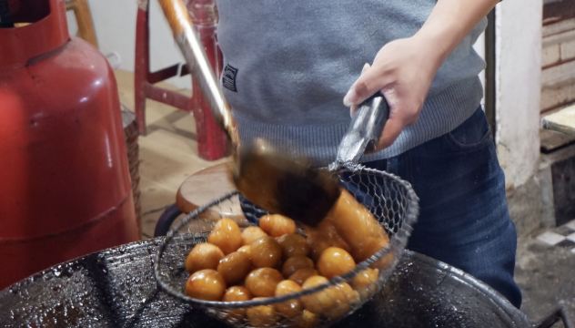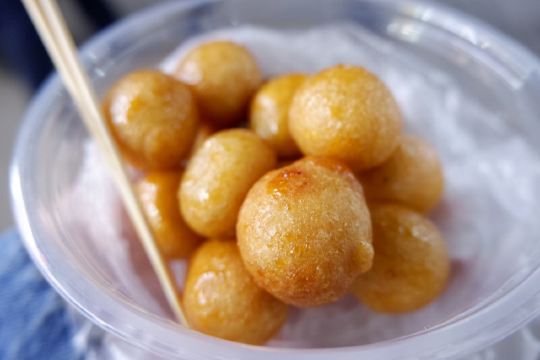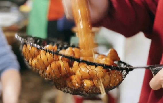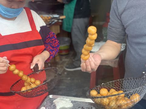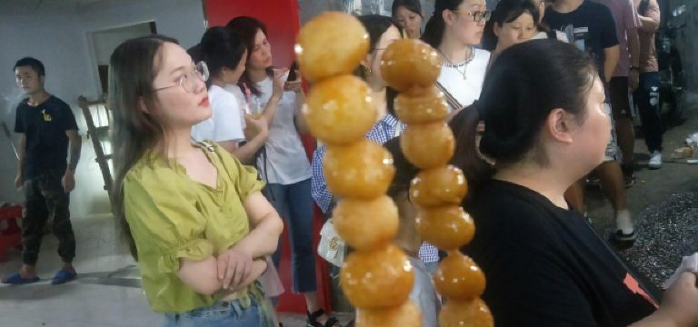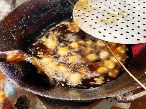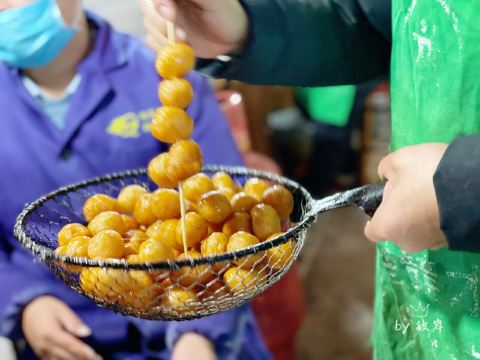 糖油佗佗是来长沙一定不能错过的特色小吃,小巧玲珑的小圆佗,外形似冰糖葫芦,油佗炸得金黄脆嫩,趁热吃还能扯出糖丝,外皮裹着均匀且厚度适中的糖衣,里面是实心软糯的糯米。脆脆的糖衣,糯糯的内馅,甜而不腻,吃完仍然意犹未尽。