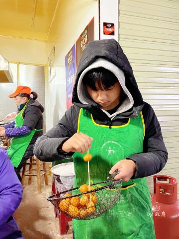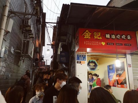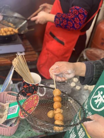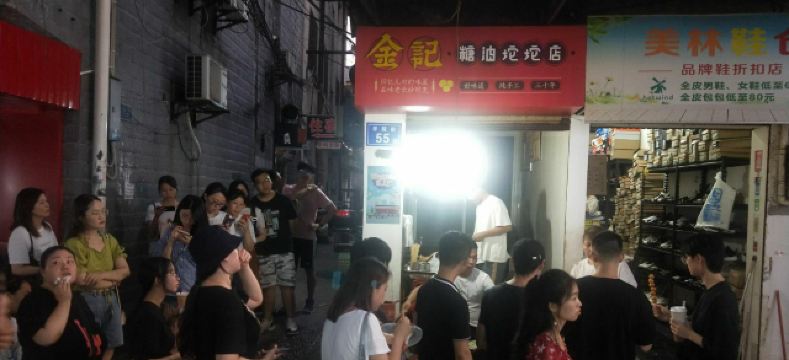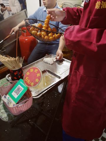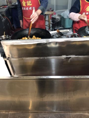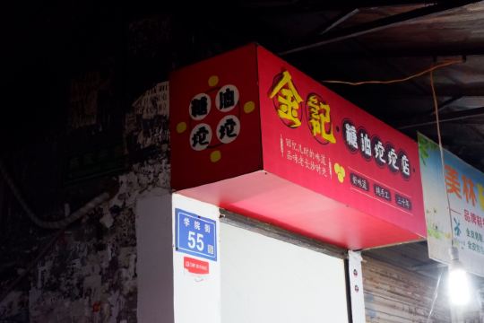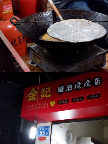 金记糖油坨坨店位于学院街55号,是个临街小门面,在长郡中学旁,临近南门口,人气很旺。 这家可以说是长沙最出名的网红糖油粑粑店了,慕名来打卡的很多。一般需要排队大概十分钟左右。 现场烹制,整个制作流程含捏、炸、捞、穿。师傅门前手艺表现还是很娴熟的。 本人点了一串糖油粑粑,又名糖油果子,价格4元一串,含7个果子,自助付款,可给现金,也可支付宝或微信扫码付款,味道确实是很好吃。建议先吹下再吃防止烫伤。 他们家的糖油粑粑外皮酥脆,表面结有一层糖皮,内空里嫩软糯,香甜入口,好吃不腻,吃完回味无穷,会有种还想接着点继续吃的感觉。