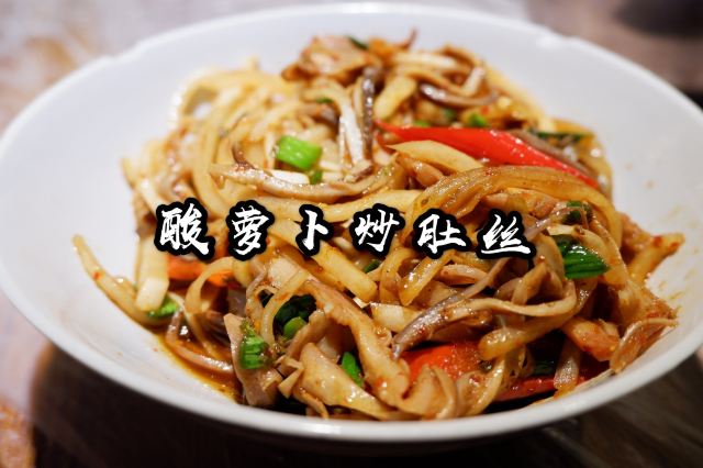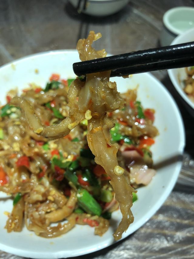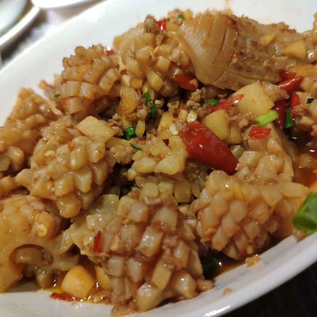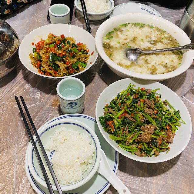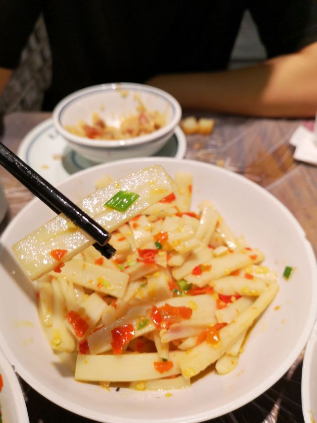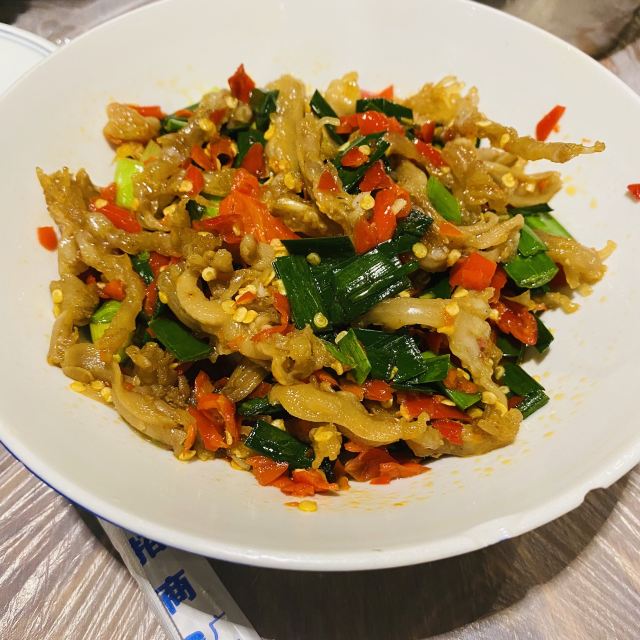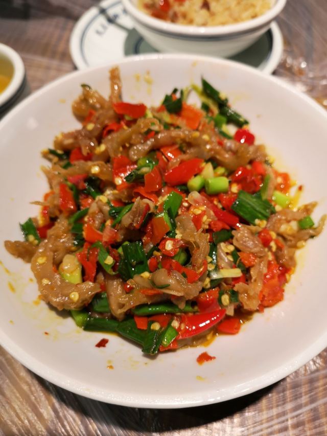YI ZHAN DENG被一例鸭掌筋搞废了。两口菜一碗饭。其他菜也下饭,主打一个吃太撑。辣椒炒肉真的特别好吃,满满辣椒的清香味。酸萝卜炒肚丝颠覆了我对肚的认知,里面的酸萝卜爽口下饭,绝配!
