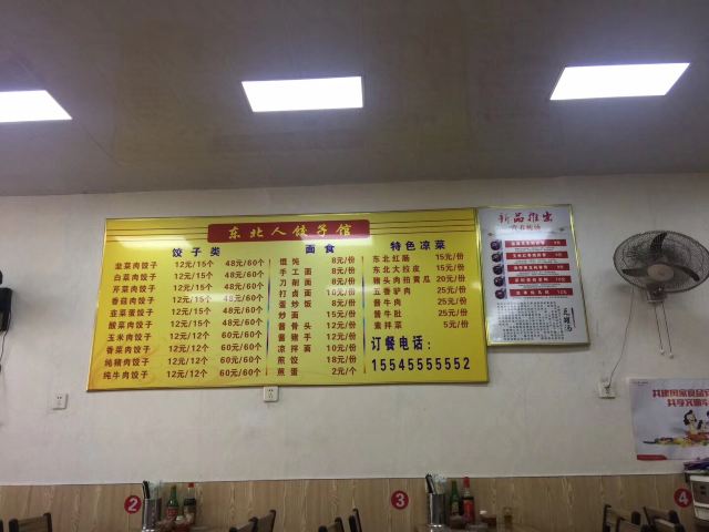 玉米肉饺子,韭菜肉饺子,纯猪肉饺子,肉丝炒面,馄饨,鸡蛋炒面,东北酒土八路,芹菜肉饺子,火腿炒面,韭菜蛋饺子,炸酱面