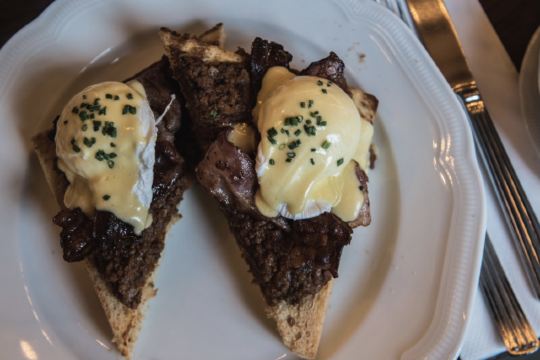 - Sloppy Joy:这流心水波蛋,水平真的是很不错,选的应该是有大蛋黄的加单,流心非常多。但其它的么,面包片就挺普通的,选的培根也就是普通薄培根啊,牛肉末质感太软了,味道也就那样。就这样一份含一杯饮料,要18欧? - Croquet Madame:盘子短上桌的时候,喵喵就已经???看着超普通啊,尝了口还是很普通啊,是谁给餐厅的勇气,定价这一份14.3欧(饮料额外付)? - Blueberry pancake:口感和想象中的不一样,有点偏粘,直到吃到中间部分有蓝莓酱的地方,混着酱后才觉得还算可以。10.5欧一份。