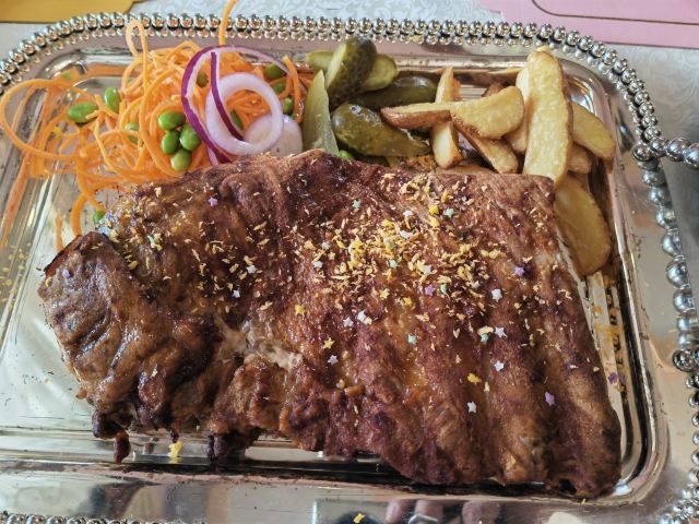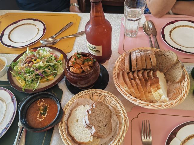 罐牛舌,炙烤鸡腿扒配面包干,红汤,面包篮,龙利鱼,罐牛肉,乌克兰红菜头豌豆沙拉,牛排,烤羊排,凯撒沙拉,俄式鱼子酱配香草面包,烤香肠土豆