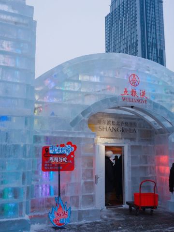 以冰雪为契 以美食为媒 沉浸式体验冰与火的碰撞 冰宫火锅盛大开业 来哈尔滨松北香格里拉冰宫开启美味冰雪之旅 香格里拉冰宫火锅,始建于2003年,建筑外墙由冰块砌成,整座建筑是一座大型冰雕。 在冰天雪地里品尝热气腾腾的火锅,这样的冬季限定特色餐厅,每年都吸引着本地和外地客人慕名而来。 今年的“冰宫”以哈尔滨火车站外观为设计灵感,可同时容纳多名客人用餐。白天晶莹剔透的墙壁,夜晚开灯后五彩缤纷的灯光照耀下更显璀璨夺目。