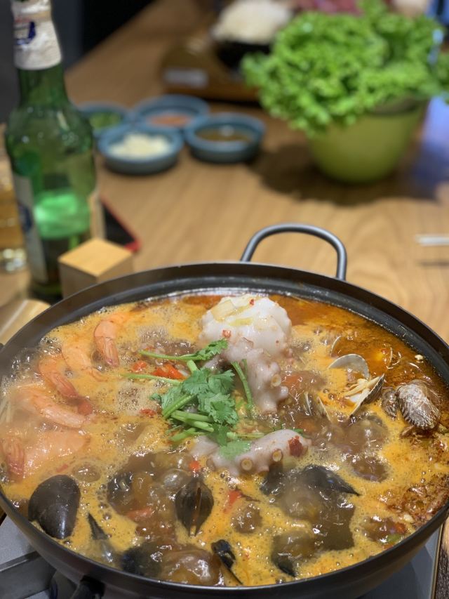 真的好久不吃部队锅了 他家的里面有牛肉,板筋,和鱼饼比以前总吃用料好很多。 装饰上很多锅盖还有意思记得首尔有个金北顺大锅家很像。感觉就是韩式的火锅,才叫大锅家的吧? 「延边黄牛肋条」喜欢吃烤肉的这个不错的,还是黄牛肉,一般吃烤肉我也会点牛肋条,烤起来好吃。 「八爪鱼锅」有个鱼缸海鲜还是挺新鲜的,感觉所有的锅泡大米饭都挺好吃。 [环境]门脸很喜欢还有唱歌的小哥哥 [服务]因为刚开吧人又多,有点点跟不上,不过我出来吃饭不会太刻意要求服务。