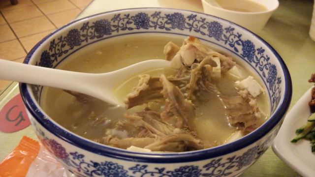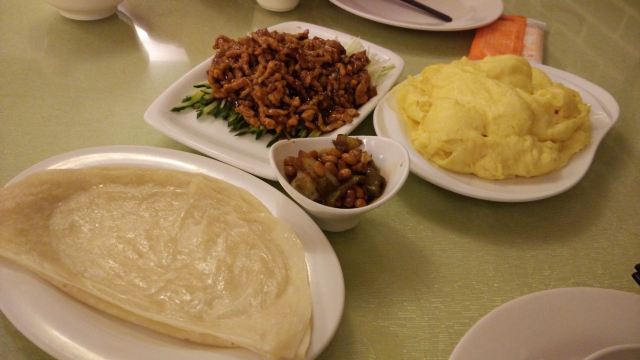 Laochangchunbing (suofeiya)之前听朋友介绍老昌春饼,味道好,价格实惠,这家分店有两层,地面一层,地下也有一层,估计算是地窖吧,下面的一层很暖和。餐单有几款不同的菜,饼、粥类,冷荤类,小炒类,汤品类等等。我们只有2个人,也不能点太多,要了一对春饼和筋饼,然后再要了一份嫩炒鸡蛋和京酱肉丝,同伴想要一些暖肚子的东西,所以就另外再要了一碗鸭架豆腐汤。菜很快就上来了,鸭架豆腐汤18元一份,超大的,起码是4个人的份量,慢慢都是材料,鸭架里带着一丝丝的肉碎,豆腐也挺不错的。汤味道也可以,同伴喝了很多碗。另外极力推荐筋饼,很薄很薄,颜色近乎于透明,有韧劲,包裹着小菜一起吃,味道极好。春饼就稍微厚了一点,软软的,相对于筋饼来说就有点干,但各有特色,同样是包裹小菜吃的。嫩炒鸡蛋,很大一盘,2个人都吃不完,鸡蛋很嫩,但味道有点偏咸了。京酱肉丝,也是满满的一盘肉丝,下面垫了小黄瓜丝,因为点餐的时候有交代不吃香菜大蒜之类的,所以就没有上。味道还不错,但同样是偏咸了。感觉东北人吃的东西都比较咸。整顿饭下来份量实在太多了,吃不完。