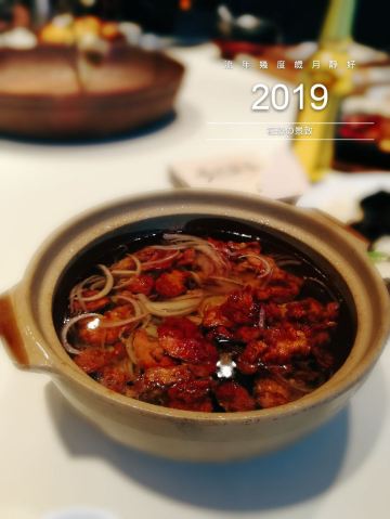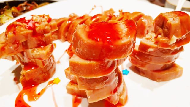 红妆人Nefelibata掀开蒸锅,端出一碗,扣上盘子,猛地一翻,揭开瓷碗,一座圆润饱满、散发着香气的金黄色的“肉山”,覆盖在洁白的瓷盘上。然后,把汤汁倒入炒锅勾少许薄芡,淋在肉上,混着特殊香味的琥珀似的肉汁,从“肉山”周边流下……