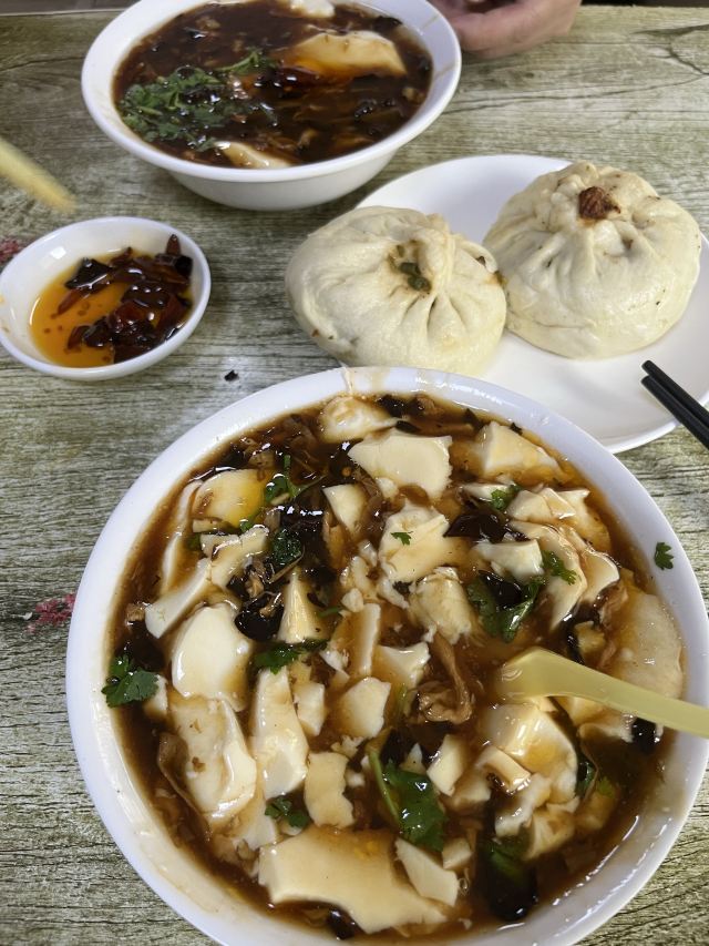 妍姐翡翠呛土豆丝,沙肝,紫菜蛋花汤,三鲜包子,牛肉萝卜包子,都不错的。