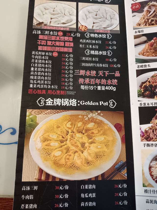 猪肉大葱馅饺子,牛肉萝卜饺子,煎饺,锅包肉,东北大拉皮,虾仁水饺都很好。