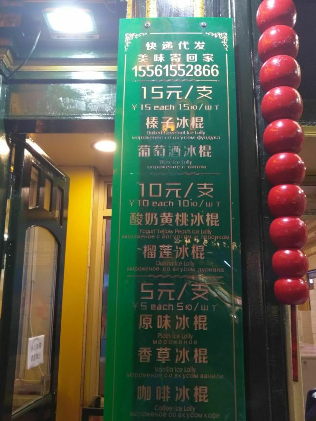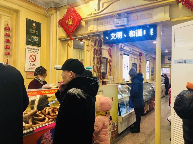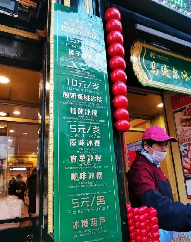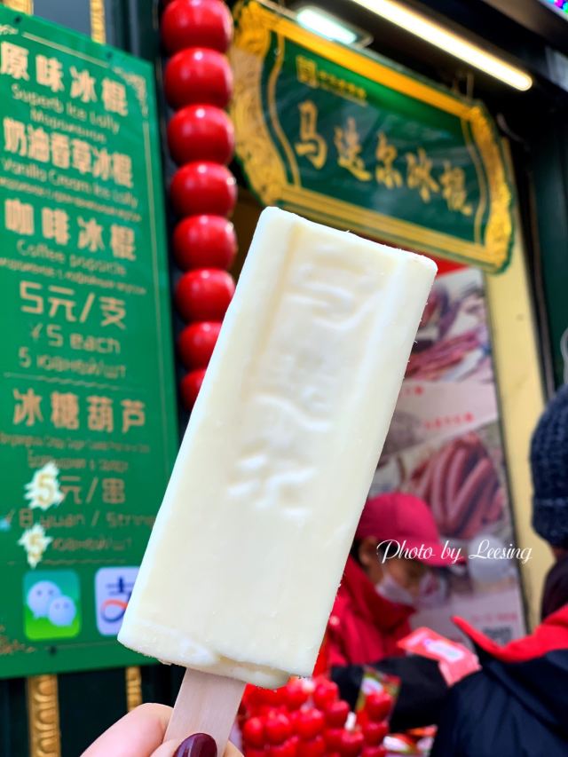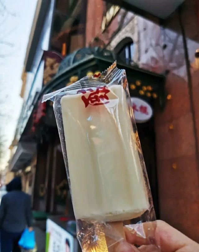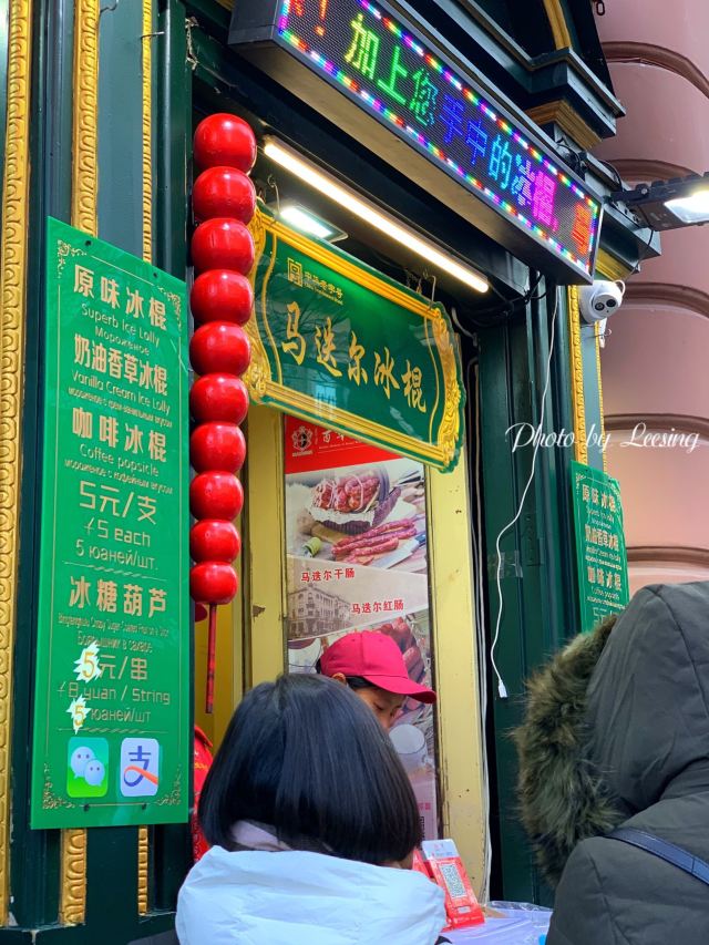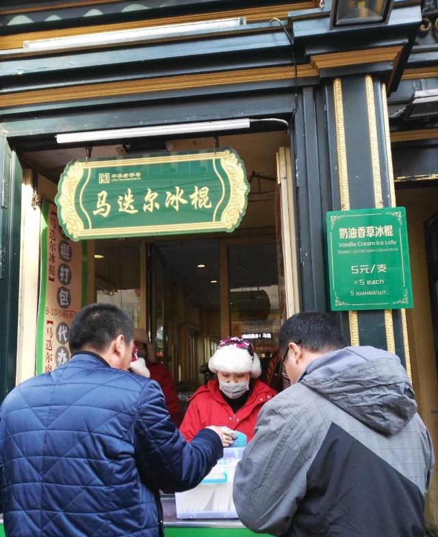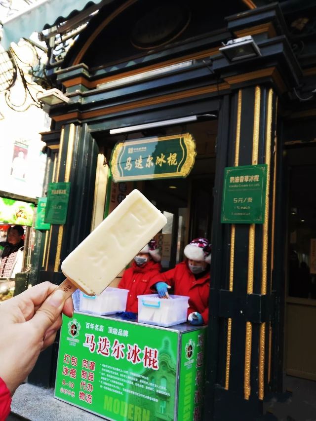 Leesing小歆来哈尔滨不得不打卡的一家店,马迭尔,这家马迭尔冰棍是当地最为正宗的一家,这里只卖有4种产品,原味冰棍、奶油香草冰棍、咖啡冰棍、冰糖葫芦,虽然如此,可是大老远处就能看到起伏的人群排着队购买。 来到这里就会发现哈尔滨零下的温度,冰棍也不需要冰箱,都是敞开放在塑料盒里直接卖的,而且冬天吃冰棍怕太冷?No,完全不用担心,外面冷,吃冰棍就一点也都不觉得冷了。 所以冰棍口味都尝了一遍,每款味道都好浓郁而且细腻顺滑,冰糖葫芦也好吃哦,里面居然还加了红枣,emmmm……,跟我们南方的不一样哦。小声bb的说一声,马迭尔太好吃了,以至于我们在中央大街呆了一天来买了三次。