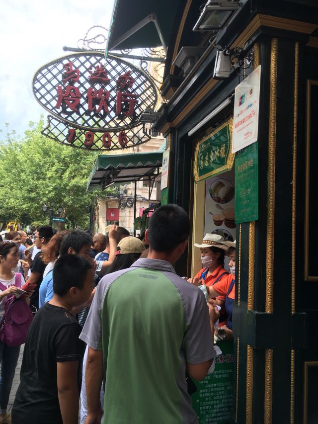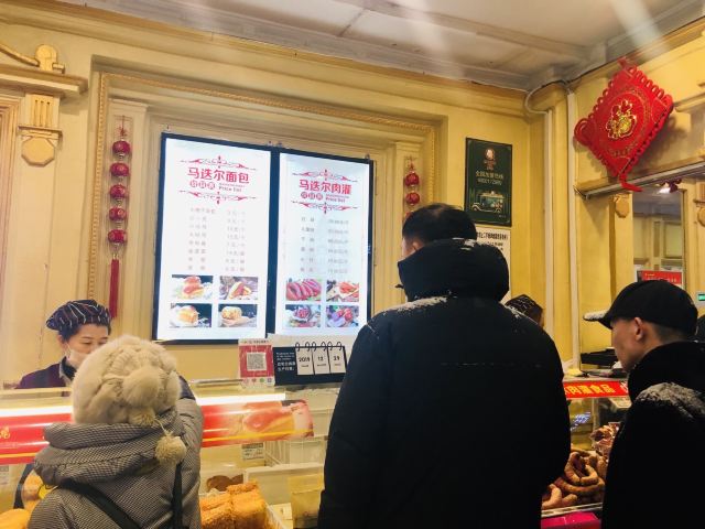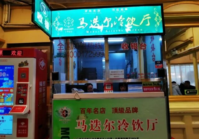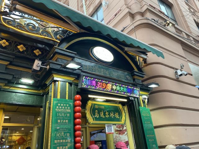 食行天下旅行家哈尔滨的知名老字号,创建于1906年,距今一百多年的历史,是哈尔滨最具特色的食品之一,知名度都能赶上哈尔滨的红肠了。马迭尔冷饮厅开在中央大街最繁华的地段,紧邻马迭尔西餐厅,旁边是中央大街美食广场,它与百年老店马迭尔宾馆都同属于马迭尔集团经营。 虽然叫冷饮厅,但他家并不止限于冰点。除了酸奶、冰棍、冰糕之外,还提供面包,烤红肠等食品。不过最经典的还是他家的冰棍,口味就两种,香草口味和咖啡口味,价格都是5元一根。吃起来给人的感觉是甜而不腻,奶味非常浓郁。据说他家的冰棍不含膨化剂,牛奶和鸡蛋投放的比例非常高,所以味道才这么好。相比较而言还是香草的最经典,口味最好,买的人也最多。他家的冰棍都没有包装,因为卖的太快,走量太大,里面做完直接就放在纸盒里端出来卖了,门口永远都是络绎不绝、源源不断的人。这次还品尝了他家的酸奶,味道也不错,只是感觉有些稀。环境上还不错,最外厅的座椅都是沙发皮座,坐着比较舒适。点一些冷饮面包可以找个地方坐下来慢慢吃。