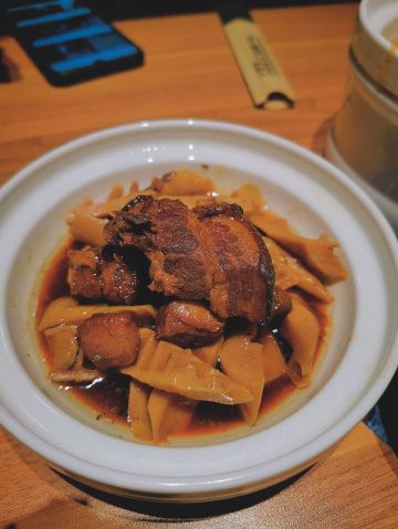 狮子头,红烧肉,脊骨,小碗米饭,炝拌干豆腐丝,酸辣海带根,爽口萝卜,合菜