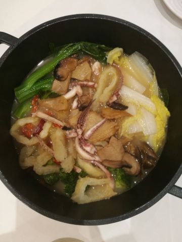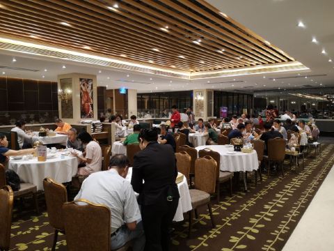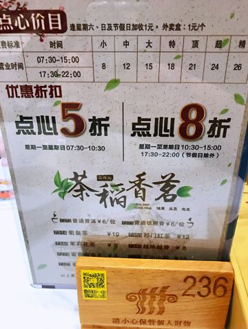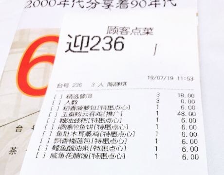 老实就奇稻香酒家(盈熙分店)位于江南大道南盈熙广场五楼,中午和朋友过去喝茶。 餐厅的店面很大,占了整整的一层楼,有多个大厅和房间,装修得富丽堂皇。中午这里的顾客很多,空位子不多。 稻香酒家近期的茶市比较优惠,早上七点半至十点半,点心五折。其余时间点心七折。难怪顾客那么多啦。 【鲮鱼酿油条】6元 一份三块,油条很大条,将鲮鱼肉酿进去,再去油炸。油条吃起来很酥脆,不过过于干身了。 【糖油糍粑】6元 一份六粒,糍粑有点甜,有点粘牙,有嚼头。 【顺德煎鱼饼】6元 一份三只,鱼饼较大块,煎得有些焦,鱼饼粉多了点,吃起来不够结实弹牙。 【稻香菠萝包】6元 一份三只,里面有点空,中间有点菠萝馅,幸好不太甜。 【飘香榴莲包】6元 不太大只,里面有榴莲馅,味道一般。 【咸鱼花腩饭】6元 这个饭的性价比很高,饭的分量是浅浅的一碟,但是有一大块咸鱼和很多的五花肉。咸鱼咸香,五花肉肥瘦适中、入味。 【鱼肚木耳蒸鸡】6元 木耳和鸡块很多,较入味。 【玉蚕粉云吞鸡】48元 上来了一个小瓦煲,里面有云吞、娃娃菜和一只大鸡腿。鸡腿略有点硬,云吞的陷不多,倒是娃娃菜淋甜。 茶位是6元/位,埋单108元,人均消费36元。消费满100元,还可以免费停车两小时。 服务方面,服务员不太够,服务一般般。