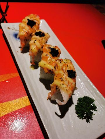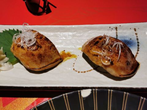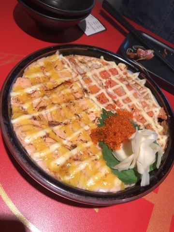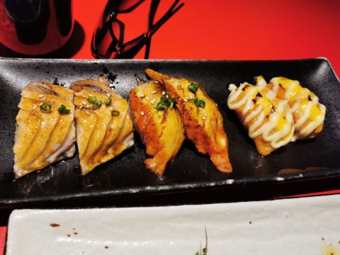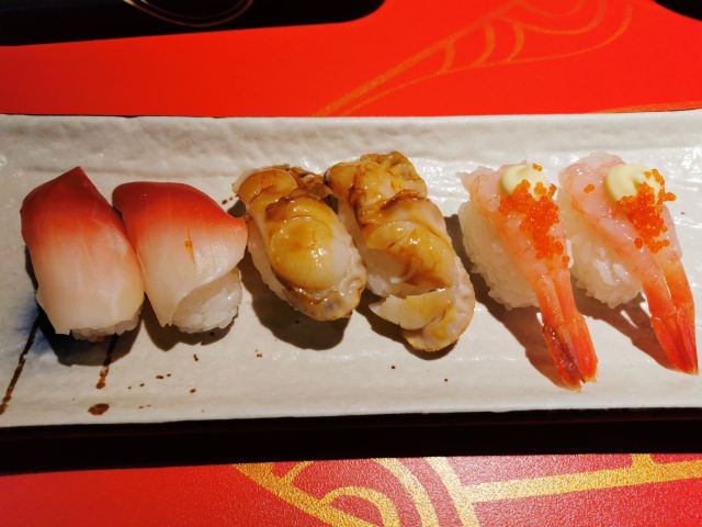 Haylie看了一篇推文决定过来试试, 出品整体真不错,招行掌上生活有优惠   盐烧三文鱼杂拼:价格不贵,味道也不错,推荐   一贯金牌鹅肝寿司:很大一片鹅肝,夹着米饭吃,不觉得腻,好吃   火焰帝王蟹棒卷:平时不怎么喜欢吃卷类的寿司,很少点,看了推荐这个就试试,真不错,中间有一块芒果,外包米饭和芝士帝王棒,很好吃,推荐   进口希鲮鱼刺身:之前对希鲮鱼不怎么感冒,但这个赤身确实不错,一份只有三片而已哦   北极贝寿司,鳗鱼寿司,火炙赤贝寿司,熟扇贝寿司,甜虾寿司,三文鱼皮寿司,这些都不错。但芥末八爪鱼的芥末味有点偏重,呛了点