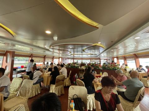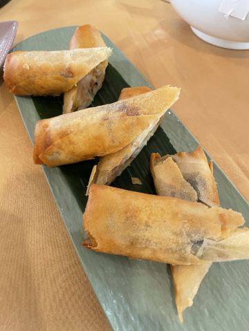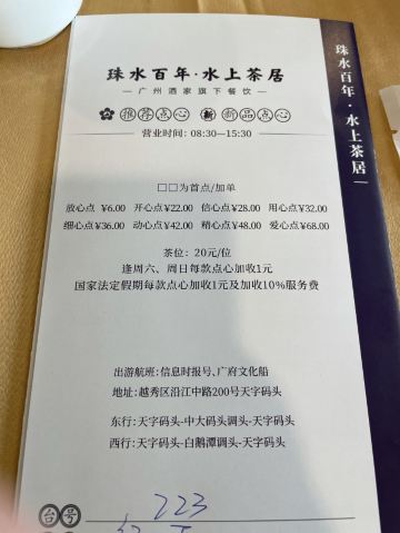 我们是11:30到13:30那个时段,坐的是二楼,取号时没有说要坐窗边(不知道说有没有用),没有坐在窗边失望。一楼有满100元减10元,二楼没有,但二楼舒服一点。 [薄荷]环境: 可以到船头或者三楼看风景、拍照,用餐共二小时,其中停码头时间加起来快20分钟。 [服务铃]服务: 服务不错,大部分都是说粤语。 「瑶柱腊味煎萝卜糕」很不错,粉不会很多,也不粘口,各材料比例刚好,煎得够香 「虾饺」「鲜虾干蒸」「龙凤鲜虾春卷」「牛肉肠」「陈年果皮牛肉球」煎饺 这几个出品也不错,整体ok吖 买单300+,只能开船务发票