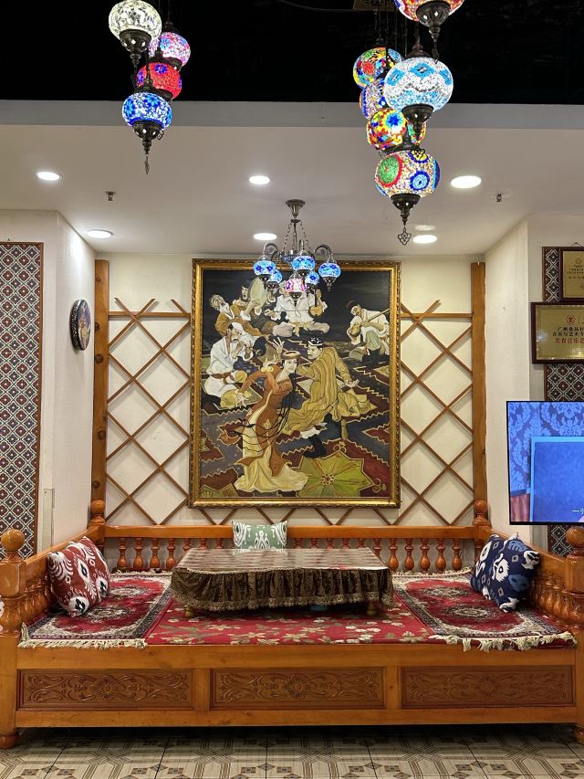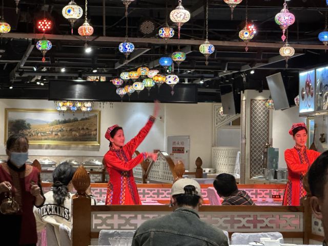 陌染MM听说新疆大厦这里的餐厅出品非常不错,有朋友吃过好,所以带我们过来尝一下。餐厅位于天河北路,市长大厦旁边,餐厅是在大楼的二楼,用餐环境挺好的,座位宽敞,大厅范围很大。晚上来到这里的,有新疆舞蹈表演,大概间隔半小时左右就跳一跳。点了几道特色菜,真是太多好吃的了,选择困难症。 这里的羊好吃,非常有羊味,而且不骚。{羊肉串},一串有四大粒肉肉,第一二四粒肉都是90%瘦羊肉,虽瘦但是吃起来一点不会硬,也不会粘牙,第三粒是55肉,半肥半瘦,吃起来更香。一串羊肉串28元,建议两人一串分着吃足够了,留点肚子尝别的菜品。 {烤羊排},这羊排可嫩了,就是看到肉的颜色就知道有多鲜嫩,肉质是粉嫩粉嫩的,上层皮烤至金黄色,稍脆,连带的骨头基本上就是脆骨,肉汁直流。 {酸奶}、{缸缸肉}也都是经典名菜,吃得停不下来,可惜胃口不大,撑不下多少,留下次机会。