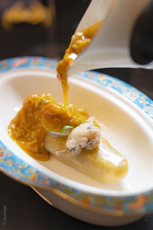椒麻拌海鲜,沙蒜苔州豆面,海皇手撕老豆腐,西班牙火腿鸡油花雕蒸大黄鱼,轩尼诗富贵虾,清鸡汤松茸炖竹笙,蟹肉海胆手卷,醉蟹冻,特选四季烤鸭,霜降鹅肝鱼籽酱烤鸭配银丝卷