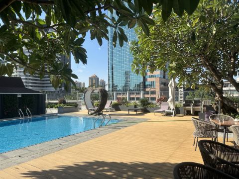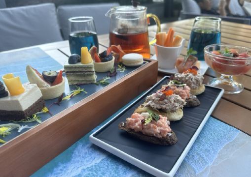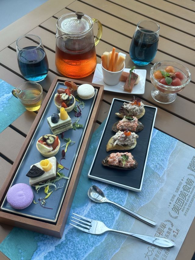 放假了和家人来到这里这个下午茶餐,餐厅在远洋宾馆的六楼,一个非常值得推荐的地方,环境特别好,加上今天的天气也是给力,温度不高风挺大的,比较适合坐在户外发呆。选了一个在游泳池附近的座位,点了一份双人下午茶餐,出品非常不错,有星级酒店的水准。对于甜点来说,也许中午吃了比较多甜食,所以更加喜欢他们家的咸点,特别是吞拿鱼和三文鱼面包,家人则更喜欢吃火腿肉。