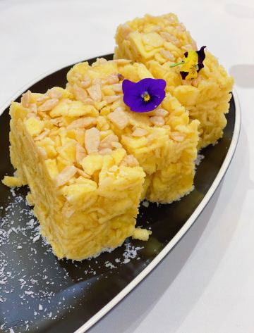 姜汁蛋散,羊城鲜虾饺,生滚葵花鸡粥,蟹黄干蒸烧卖,杞子桂花糕,鲍汁凤爪,芝士焗糯米鸡,香煎萝卜糕,艇仔粥,叉烧包,粤式早茶