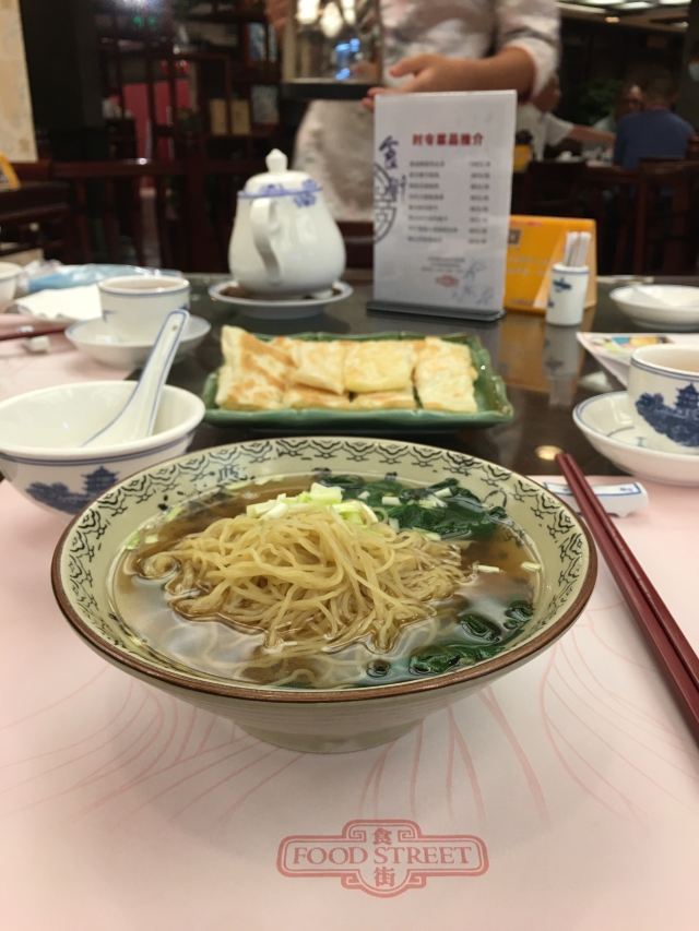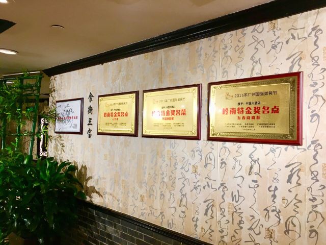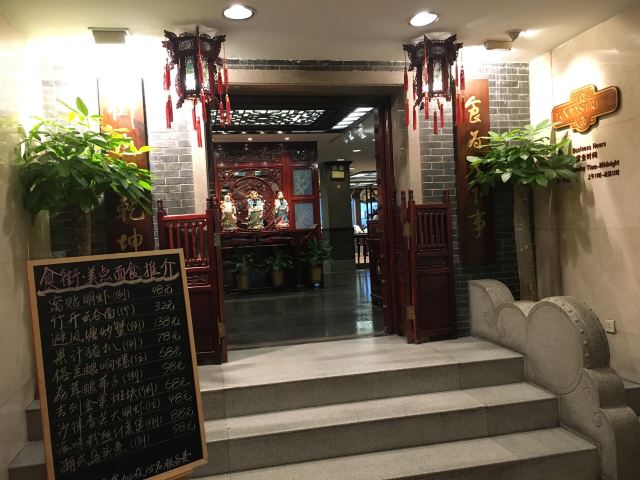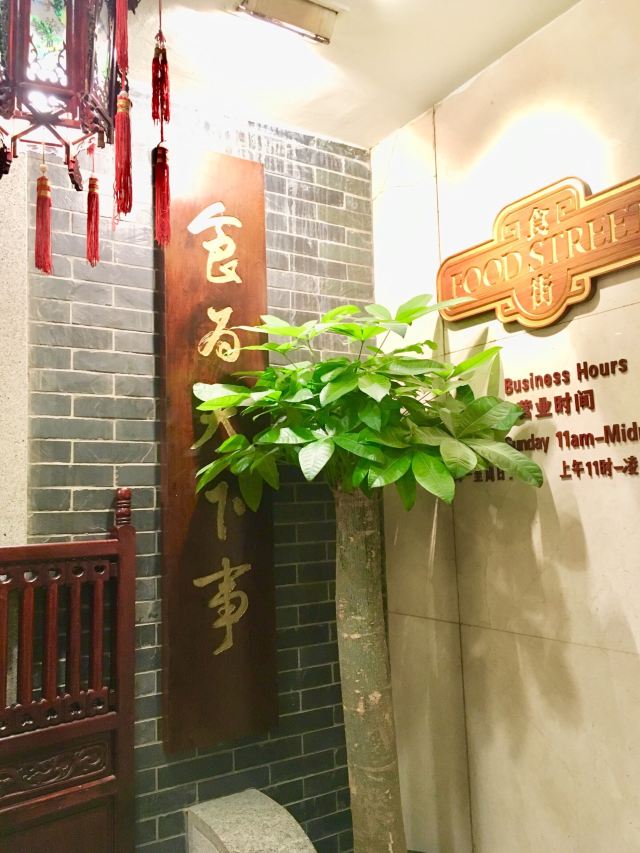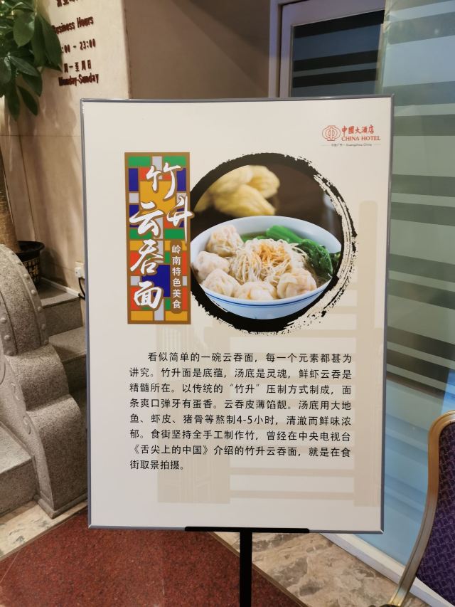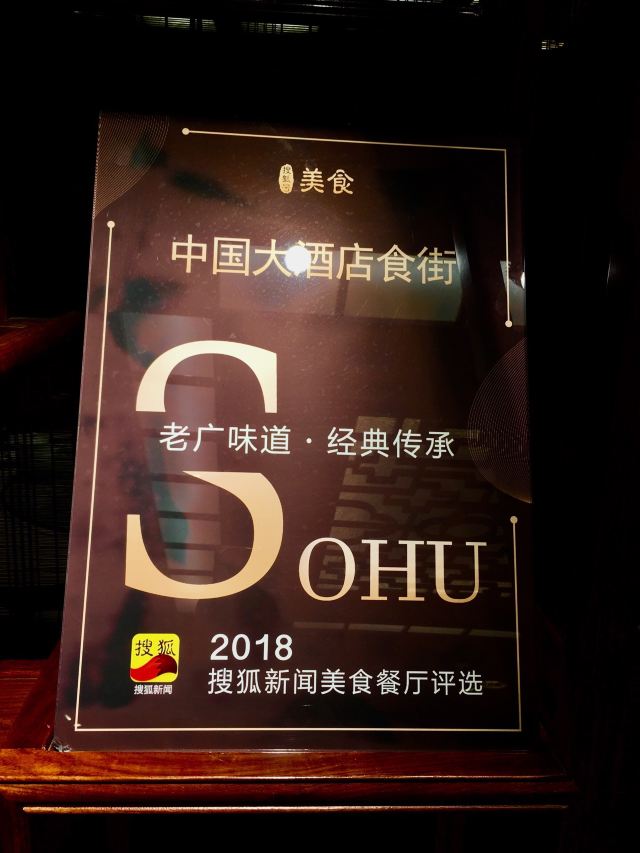 Food Street(China Hotel)1、广州若说到五星级酒店(宾馆)饮茶美食,花园酒店、白天鹅宾馆、东方宾馆等比较而言,我会更喜欢到中国大酒店食街多一些。 2、今天(4月14日),我俩和好友,又到中国大酒店食街午餐(饮茶吃饭),点食如下:冬瓜鱼茸粥、斋汤面、白菜鲜肉饺八、竹笙高汤鲜竹、菠萝咕噜肉、浓汤杂菇浸菜苗、金牌叉烧酥。 总体而言,出品、口感,色香味形均佳,食材优质新鲜,烹饪水准堪称一流。价格虽然有些高,但是若以同类型的五星级酒店(宾馆)相关价格相比,则处中位数水平,再以品质出品、份量大小等有关性价比而比较,则食街品尝美食的性价比显然是高的。值得点赞是,食街的广府美食,粤点粤菜的出品,做得十分正宗而优质。食街因此亦荣获“老广味道-经典传承 2018 搜狐新闻美复覆厅评选 ”,这也是名副其实,实至名归的。 3、若然喜欢到高档一些的场所(环境),品试广府美食,中国大酒店食街实在是最佳选择之一。 “食为天下事 街内富乾坤”这是食街门口一副嵌头字对联,食街此乾坤,值得你去茶聚饭局。 4、食街美食之后若游玩,附近有西汉南越王博物馆、越秀公园、流花湖公园等。