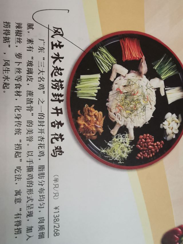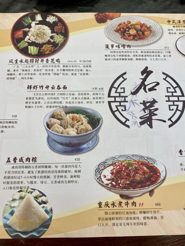 竹升云吞面 (鲜虾、鲜肉),五香咸肉粽,冬瓜鱼茸粥,菠萝咕噜肉,黑白胡椒虾,电饭煲焗乳鸽,翡翠浓汤鲈鱼,中式牛柳,真味鸡,响油鳝糊,乳鸽,云吞面,状元及第粥