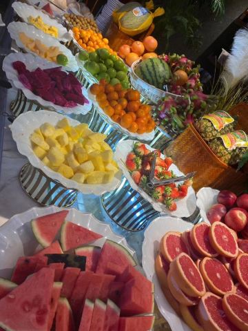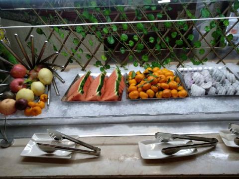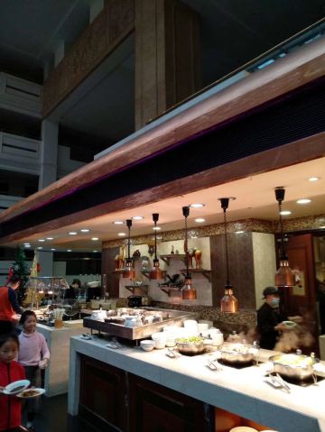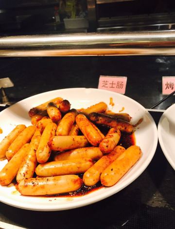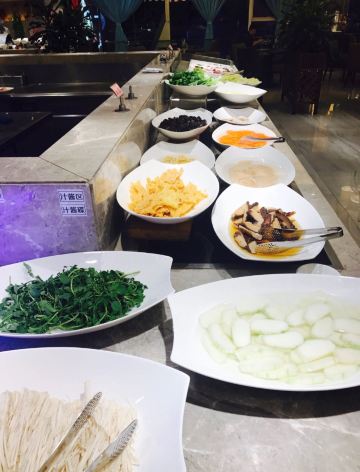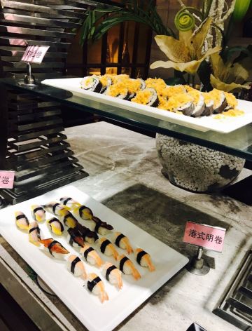 来二沙岛吃自助餐,在江边风景好,吹吹风好凉爽。用餐的地方在二楼,工作日过来人不多,舒服。有服务员带位,坐下递水,服务好。 第一时间当然是拿刺身,有三文鱼,绸鱼,醋青鱼,白金枪鱼。运气好还能拿到三文鱼腩。吃完生再吃熟,螺肉和鲜虾新鲜,每个桌子上都配有小炉子,可以吃火锅,肥牛、鹅肠、小香肠、鱿鱼、蔬菜等等,想吃啥就涮啥。点心小笼包肉汁多,皮薄。 甜品饮料处也有不少东西,居然看到一个大蛋糕,蓝莓味水果夹心,水果挞饼底厚,