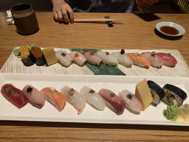 黑松露配章红鱼刺身,海胆刺身,和牛盐烧,冻鹅肝,盐烧鳗鱼,白子刺身,海胆寿司,天妇罗拼盘,牛油果软壳蟹卷