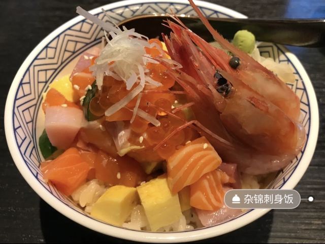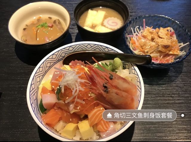 陌染MM这家日本料理位于珠江新城,离公司也不算太远,中午和几个同事踩着小黄就过去吃饭了。餐厅门前的那一条路不是大路,行人也不算太多,应该都是附近居住或者上班的人才知道吧。餐厅挺大的,中间是散台,旁边一圈是包厢,包厢需要脱鞋子进内。工作日中午有套餐,价格从68元起,角切刺身饭是88元,在珠城来说,都是差不多价位。刺身饭不是我点的,但是看上去分量还是挺多的,各种刺身的颜色也挺新鲜,色泽都是鲜艳的,我偷吃了一小块三文鱼刺身,感觉不错。 另外有一款也是88元的,叫岚山便当,这个挺有特色,用一个分了十小格的木盒子装了十种不同的食物,有刺身、炸物、碗蒸、水果、凉拌、小吃、煮物、寿司等十份东西,虽然分量都是一点点,不多,但是十种食物加起来就很满足了,还是那些有纠结症的客人最佳选择。我点了一份猪肉生姜烧,也许是不同餐厅,做法不一样吧,这里的是用一个锅子装着,别以为这么大一锅都是肉,其实下面都是米饭,上面铺了大概五片肉而已,然后就是一大堆的洋葱,我是不喜欢吃洋葱的,所以剩下能吃的也就不多了。肉片比想象中的薄得像肥牛那样的肉要厚,由于有一定厚度,所以肉没有卷起来。 套餐有包咖啡、茶、水果或者雪糕,雪糕有葡萄味、巧克力味和芝麻味,会不会经常有变化就不清楚了,我吃了巧克力味的,一般般,里面有一点棉花糖,不够那种有巧克力粒的好吃。