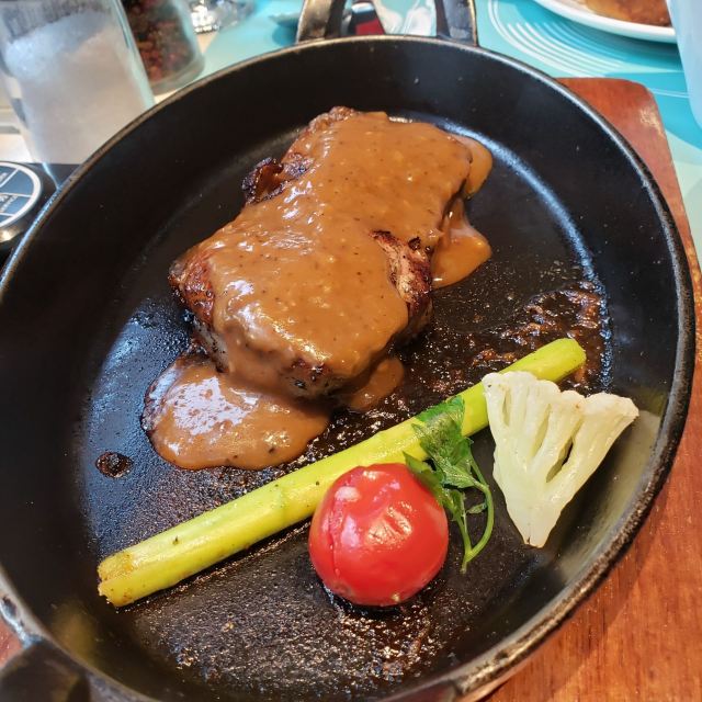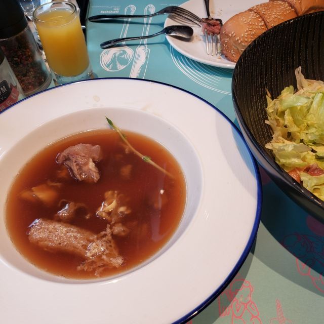 傅诗成淇毅今天生日又来西提牛排,实话,挺失望。 安格斯肉眼牛排^又是生日券送的,但是,这次,牛扒有点老,口感柴,而且没有味道,要自己加盐,这是这家特色? 松茸花胶牛尾高汤^这个真的味道反而很浓,但是汤水却很稀薄,牛筋根本没熬烂,嚼不动。 三文鱼大虾海鲜沙拉^这个算是三个菜里面最可以的了,三文鱼和虾都很新鲜,分量足,但是紫甘蓝太大块不方便吃,然后酱料太少。 环境: 是黑冷格调的西餐厅,座位比其他店宽敞,有靠窗位置。 这次本来想好好庆祝生日结果味道不满意而且分量明显感觉缩水了, 服务: 对于友好的服务态度方面勉强给出3⭐下次不会再选择。哦,对了,研磨海盐的瓶子很明显平时没检查,一打开盖,盐撒了我一身。。。